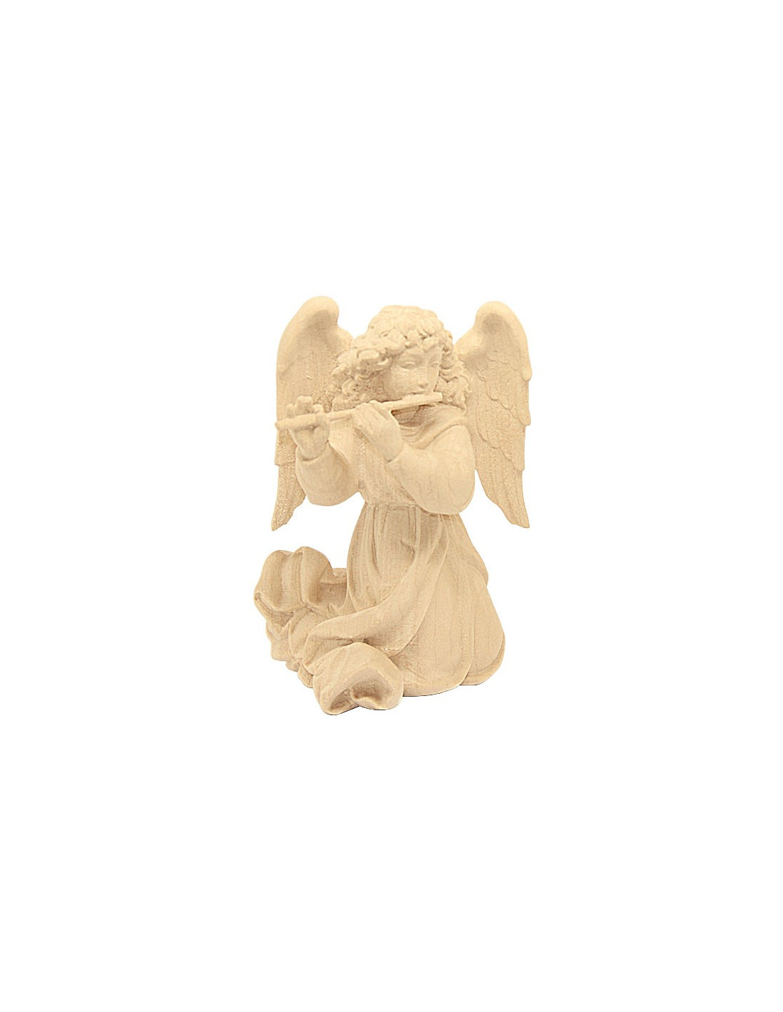 Ángel músico con larga toga, arrodillado y tocando la flauta travesera, tallado en madera natural clara.