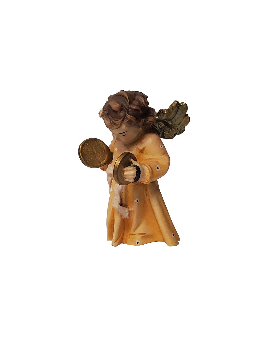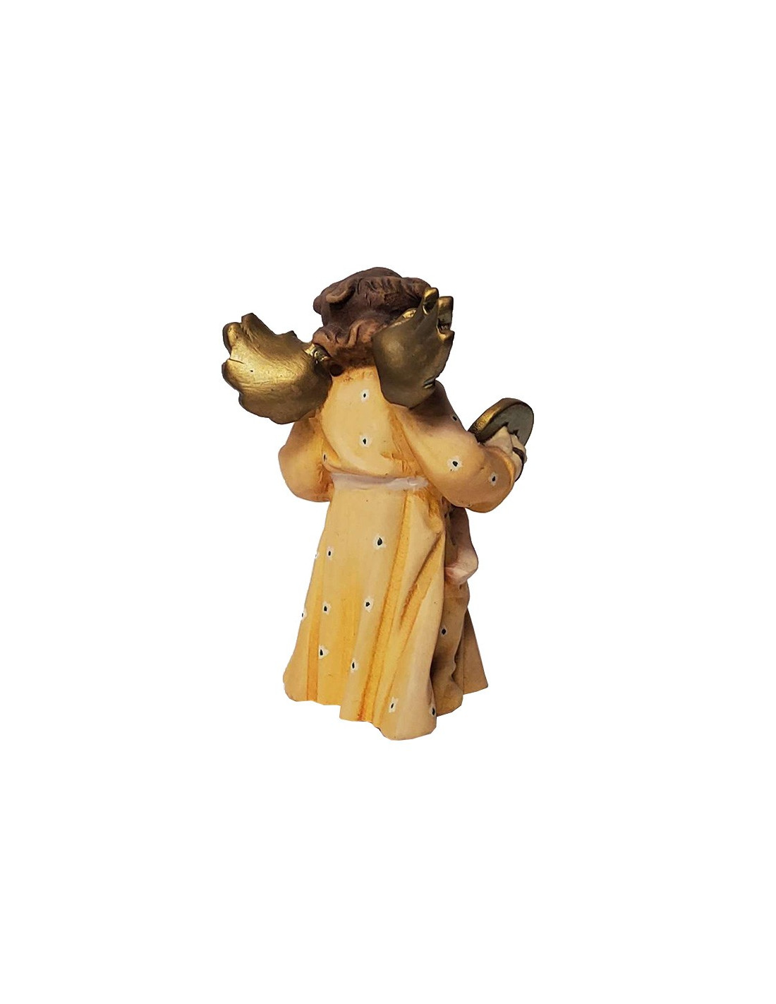 Ángel musical con toga larga de flores, tocando platillos, tallado en madera natural de color claro y pintado a mano. Las alas están pintadas de dorado para una mejor apariencia.