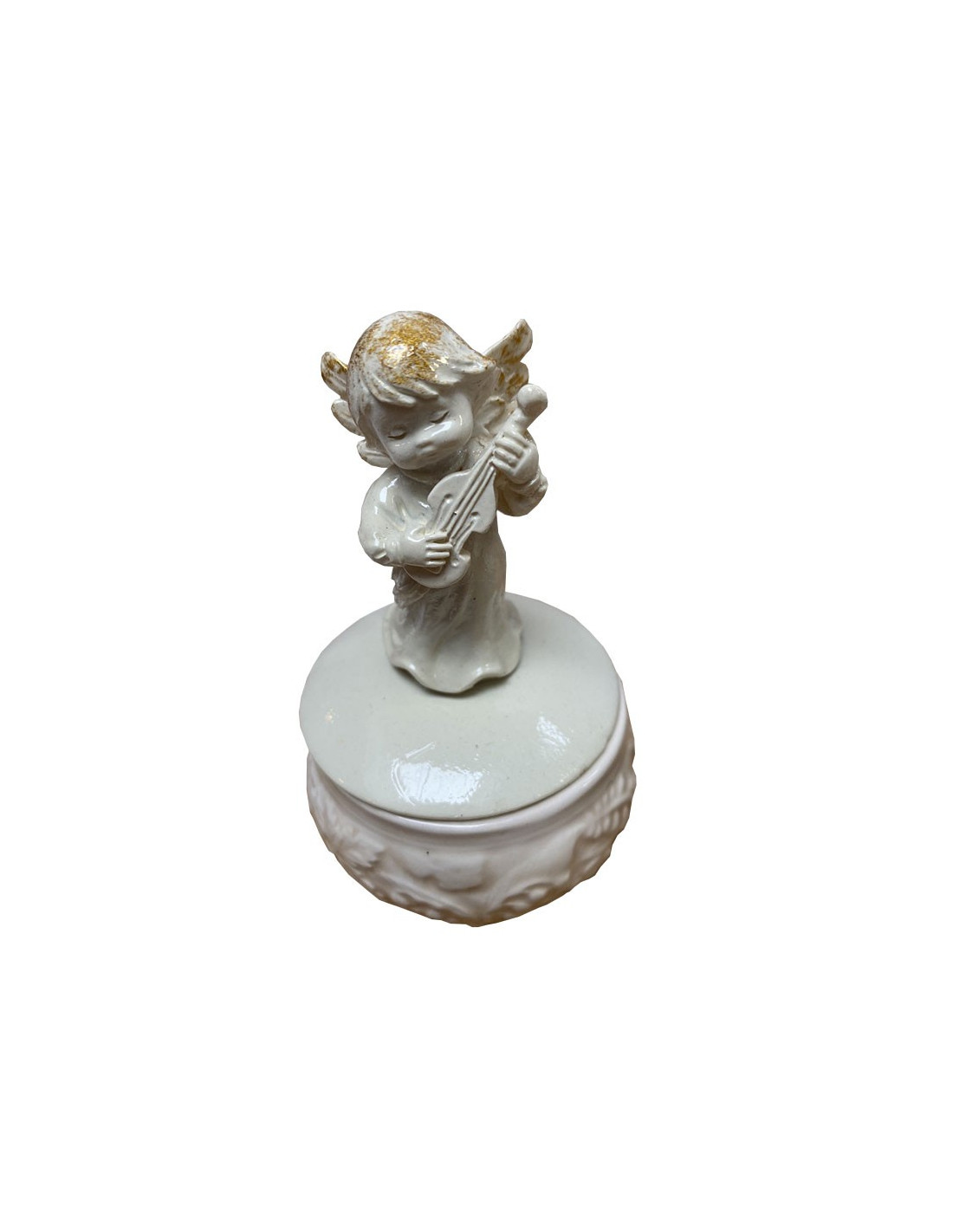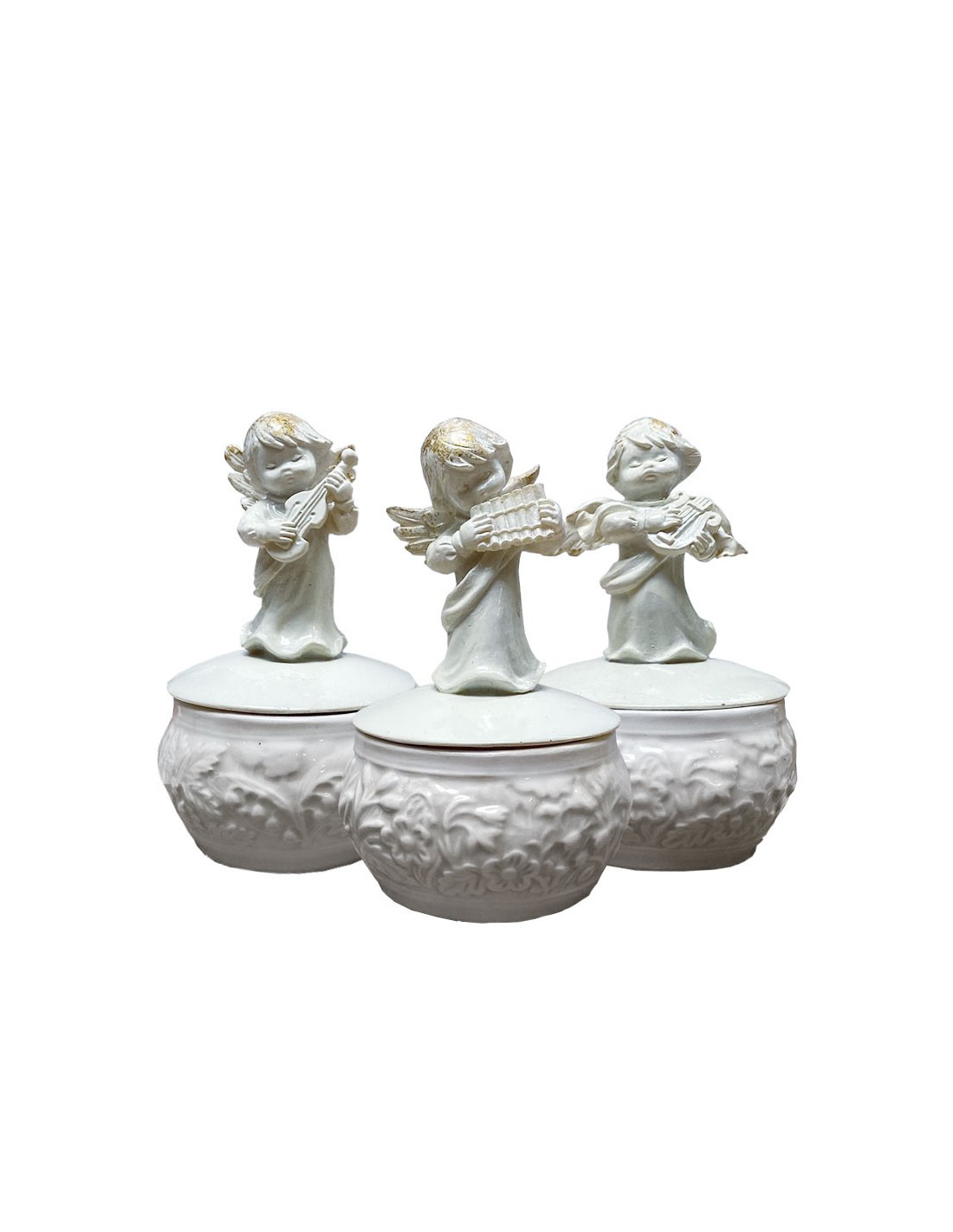 Bomboneras de cerámica inglesa de color blanco crema con ángeles musicales. Estas tres pequeñas cajas están finamente esculpidas. Cada ángel toca un instrumento diferente: una lira, una mandolina y una flauta de pan.