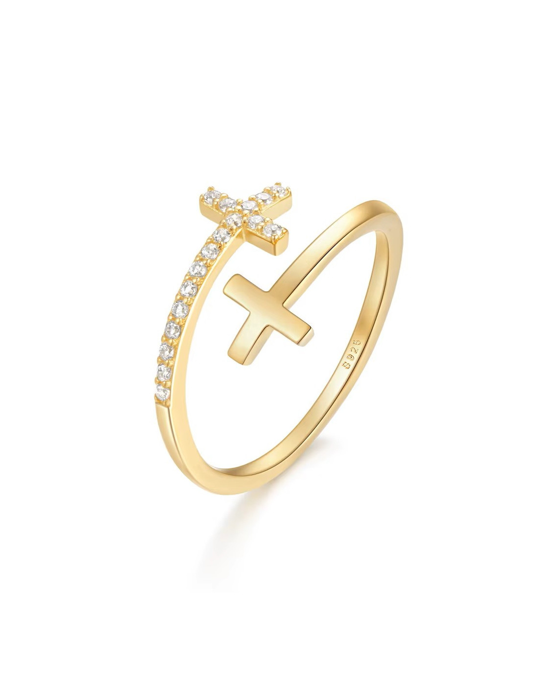 Anillo doble cruz en plata S925 chapado en oro – Ajustable con circonitas