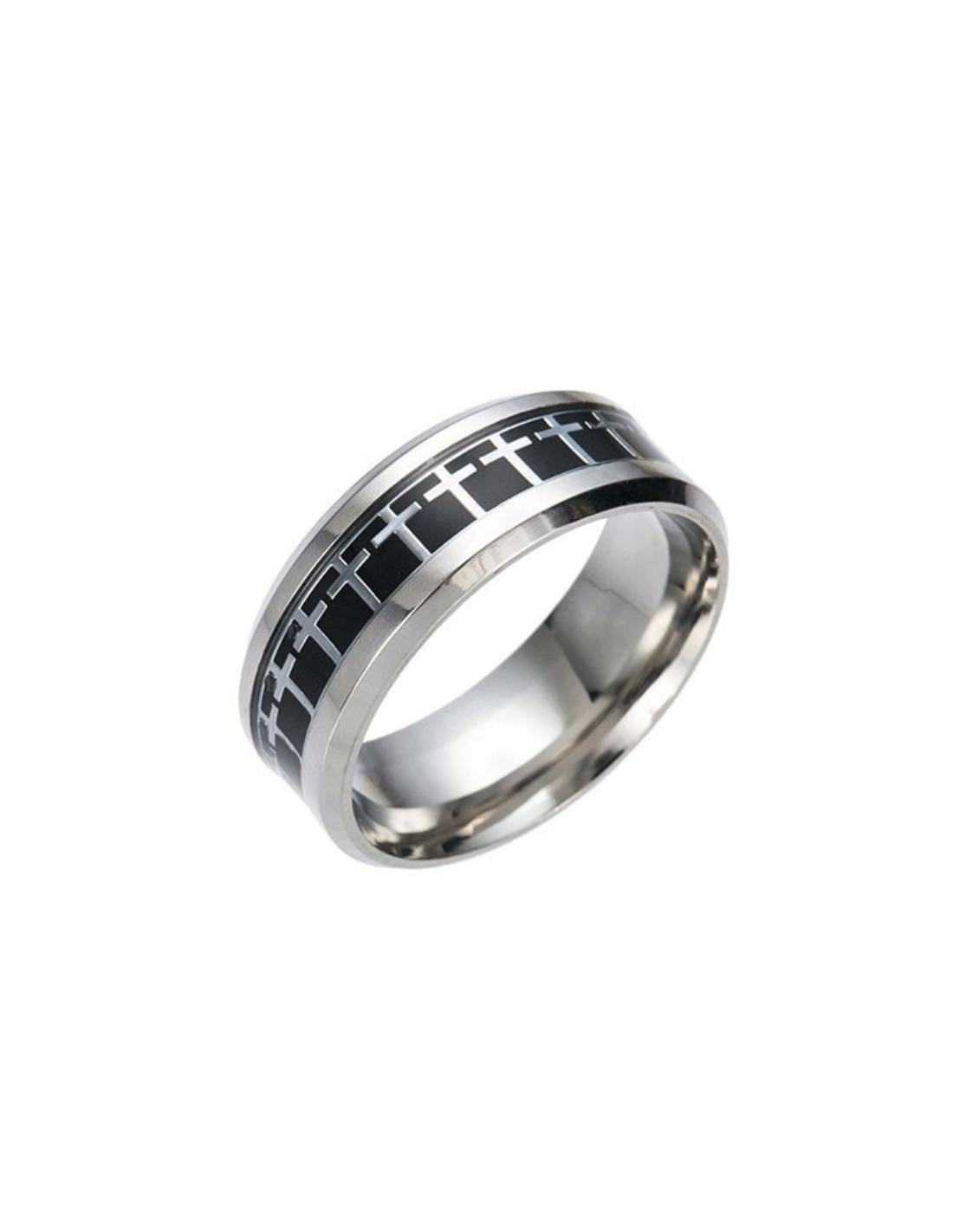 Este anillo de acero inoxidable tiene un patrón negro mate que destaca una serie de cruces. La plata resalta muy bien con el negro en el grosor del anillo. El acero inoxidable es de muy buena calidad y tiene una larga vida útil y no cambia de color con el día a día.