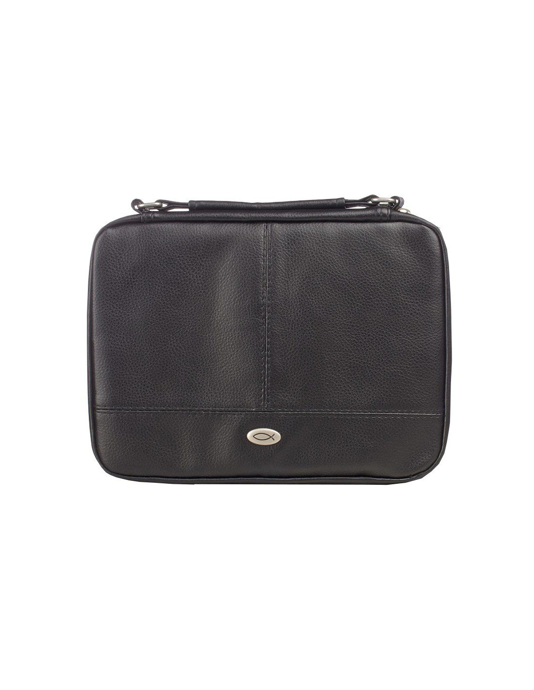 Con un asa en la parte posterior, la tapa se divide en dos compartimentos: uno para guardar la Biblia y el otro para los accesorios de estudio. En el primero, puede deslizar la cubierta de su libro en las secciones proporcionadas. El lado izquierdo está adornado con un bolsillo con cremallera y malla. Se proporciona un bolígrafo de doble punta (bolígrafo por un lado y marcador amarillo por el otro), sujeto con una banda elástica. El segundo compartimento tiene múltiples bolsillos para guardar lupas, bolígrafos, blocs de notas, etc. Se proporciona un bloc de notas rayado con citas bíblicas. El conjunto se puede transportar fácilmente gracias al asa a la altura de la encuadernación. Las cremalleras metálicas están estampadas con la señal de la cruz mientras que el frente de la tapa está decorado con el logo del pez en un óvalo plateado metálico.