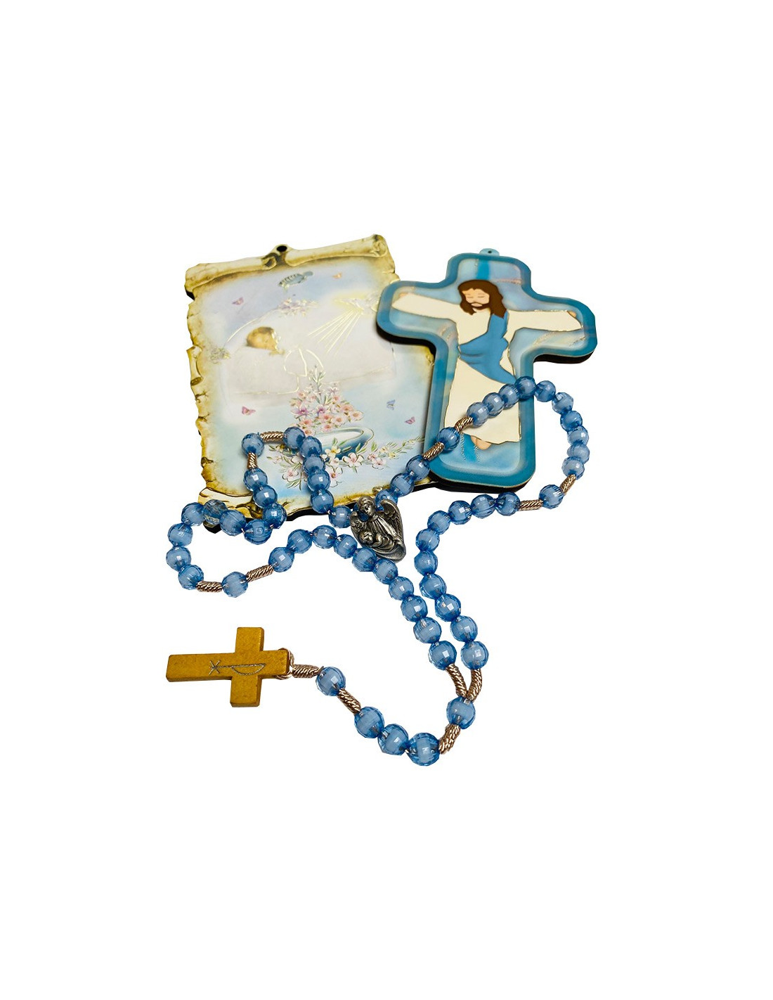 Regalos de nacimiento para proteger al recién nacido. Este kit se compone de una placa mural que imita un pergamino que representa un bautizo, una placa mural azul con Jesucristo, un rosario Pax azul y un broche Ángel de la Guarda.