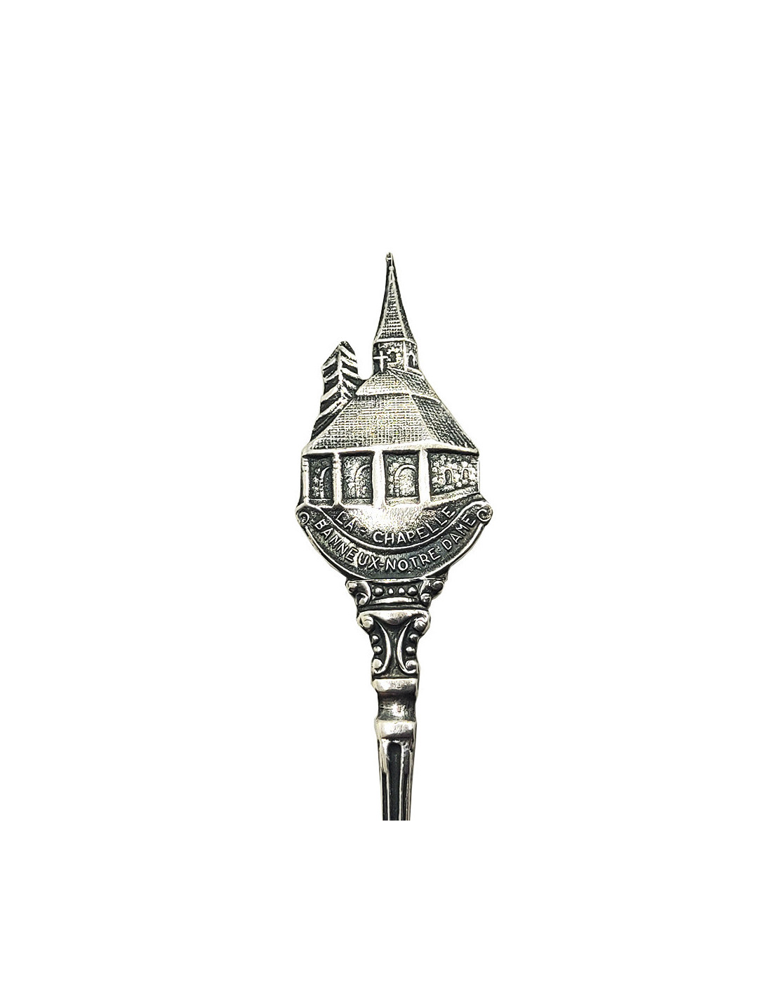 La parte superior de la cuchara presenta una delicada representación de la capilla, mientras que el mango está decorado con motivos elegantes y redondeados, entre los que destaca una especie de concha.