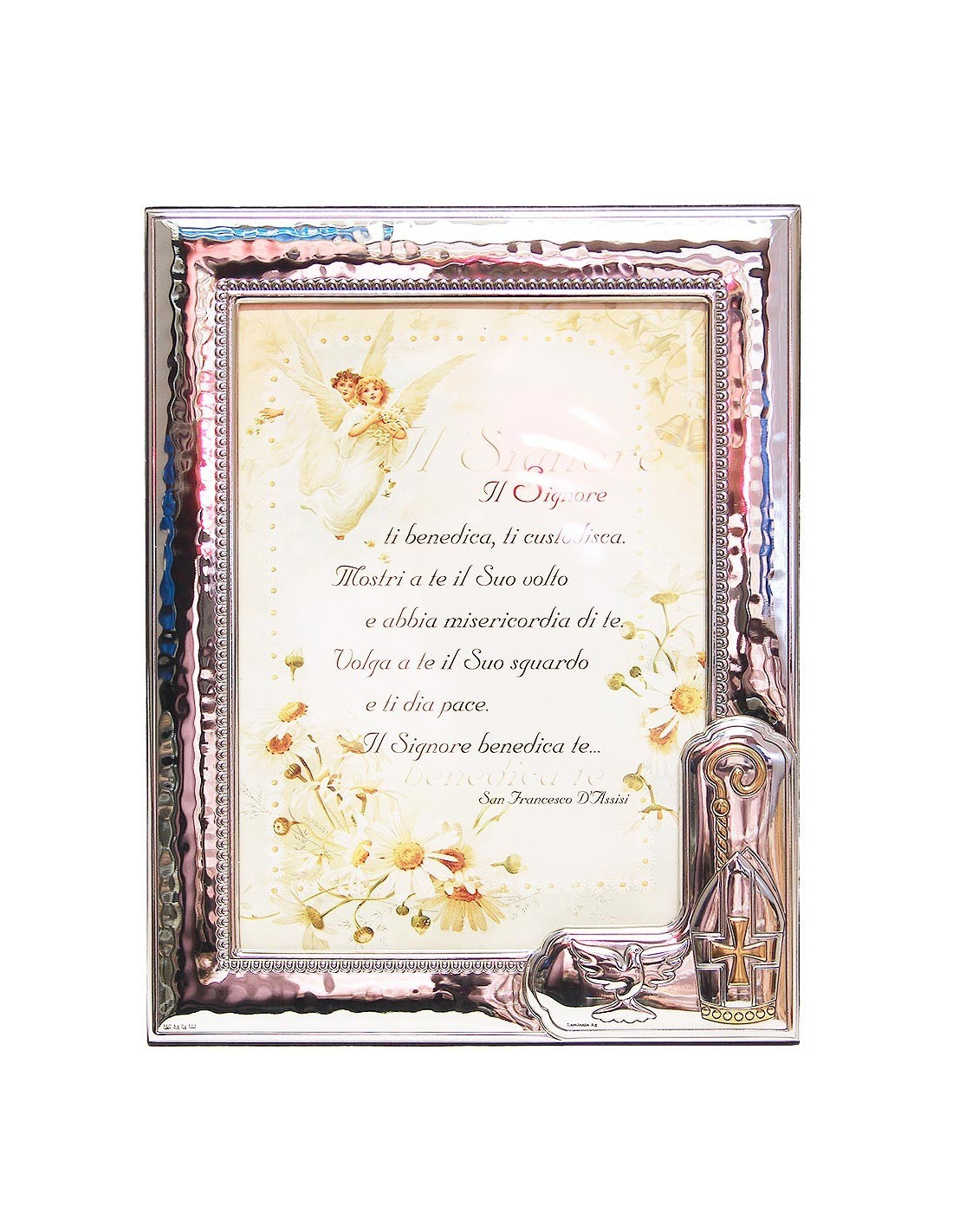 La confirmación es el sacramento que fortalece la fe cristiana después del bautismo. Celebrada a menudo durante la adolescencia, marca el compromiso personal de la persona confirmada de vivir plenamente su fe, fortalecida por los dones del Espíritu Santo. Ofrecer un marco de plata, como éste firmado Valenti, expresa la importancia y solemnidad de este acontecimiento espiritual. Sus refinados ornamentos, a menudo decorados con símbolos como la paloma y el báculo del obispo, recuerdan la bendición y el acompañamiento divino.
