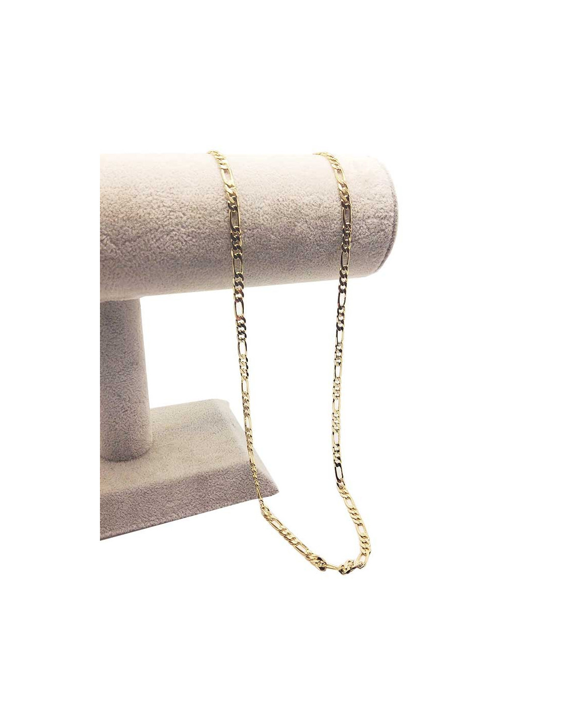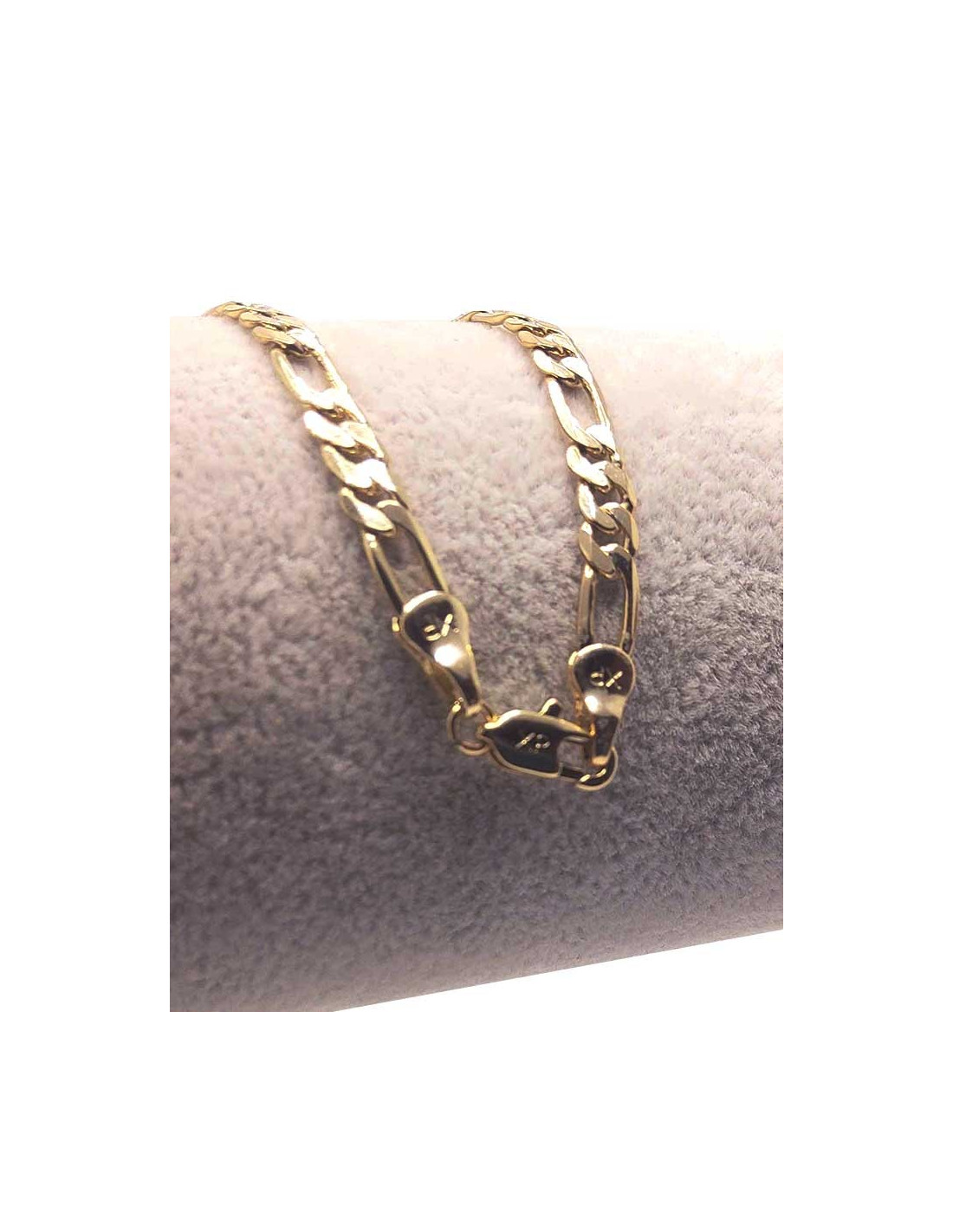 Cadena figaro de 55 cm en cobre chapado en oro de 14k. Las cadenas Fígaro se reconocen por sus eslabones de diferentes tamaños, una sucesión de un eslabón largo por cada tres eslabones cortos. Un diseño asimétrico para un estilo moderno.