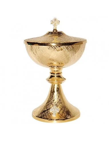 Este magnífico copón de latón chapado en oro combina elegancia y sacralidad. Diseñado para contener las hostias consagradas, es una hermosa pieza litúrgica, perfecta para el altar o el sagrario.