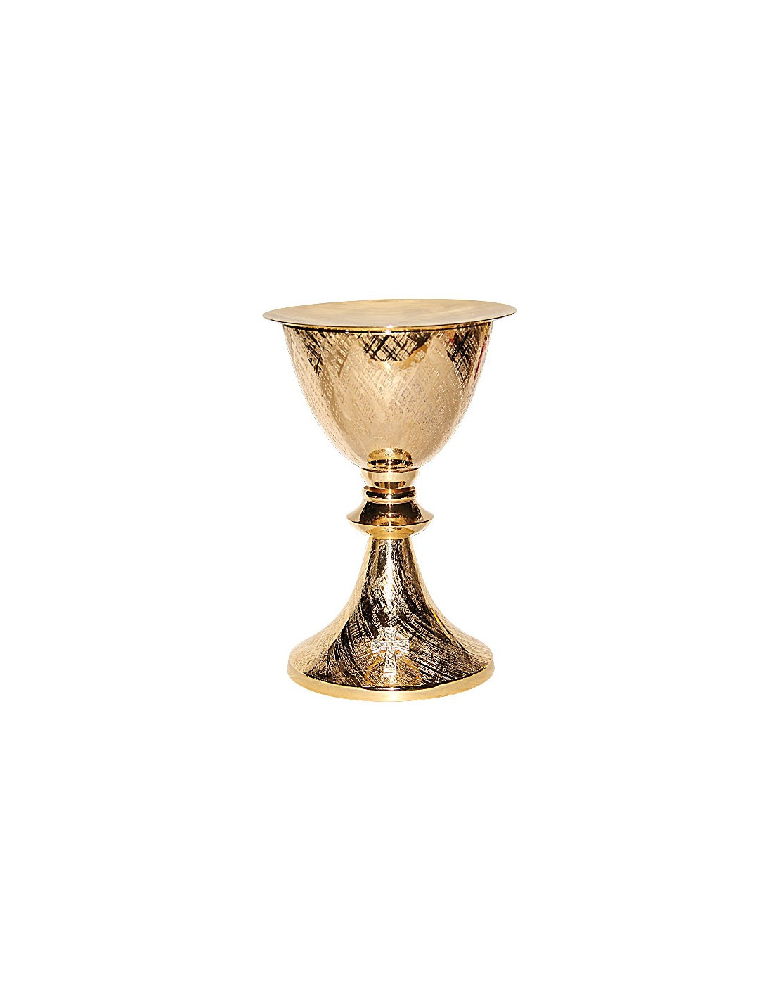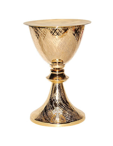 Este cáliz de latón dorado está especialmente diseñado para la celebración de la Eucaristía. Elegante y armonioso, combina la nobleza del material con un acabado cuidado, ofreciendo una presencia digna y solemne sobre el altar.