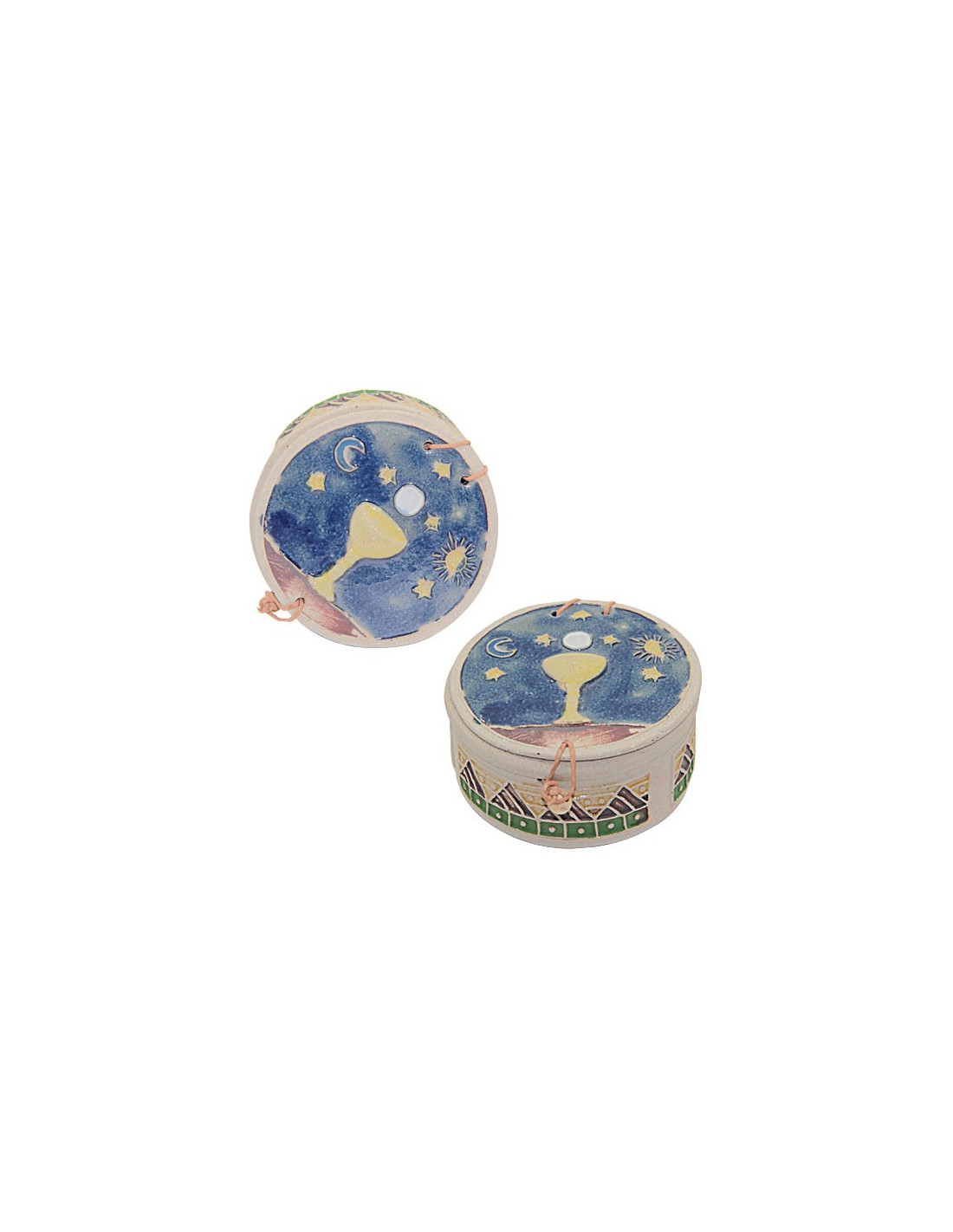 Caja para hostias realizada totalmente a mano en terracota. La caja es redonda e incluye el símbolo de la Eucaristía: un cáliz dorado coronado por la hostia. El cáliz aparece sobre un fondo estrellado pintado y esculpido, mientras que la caja es de color terracota claro natural.
