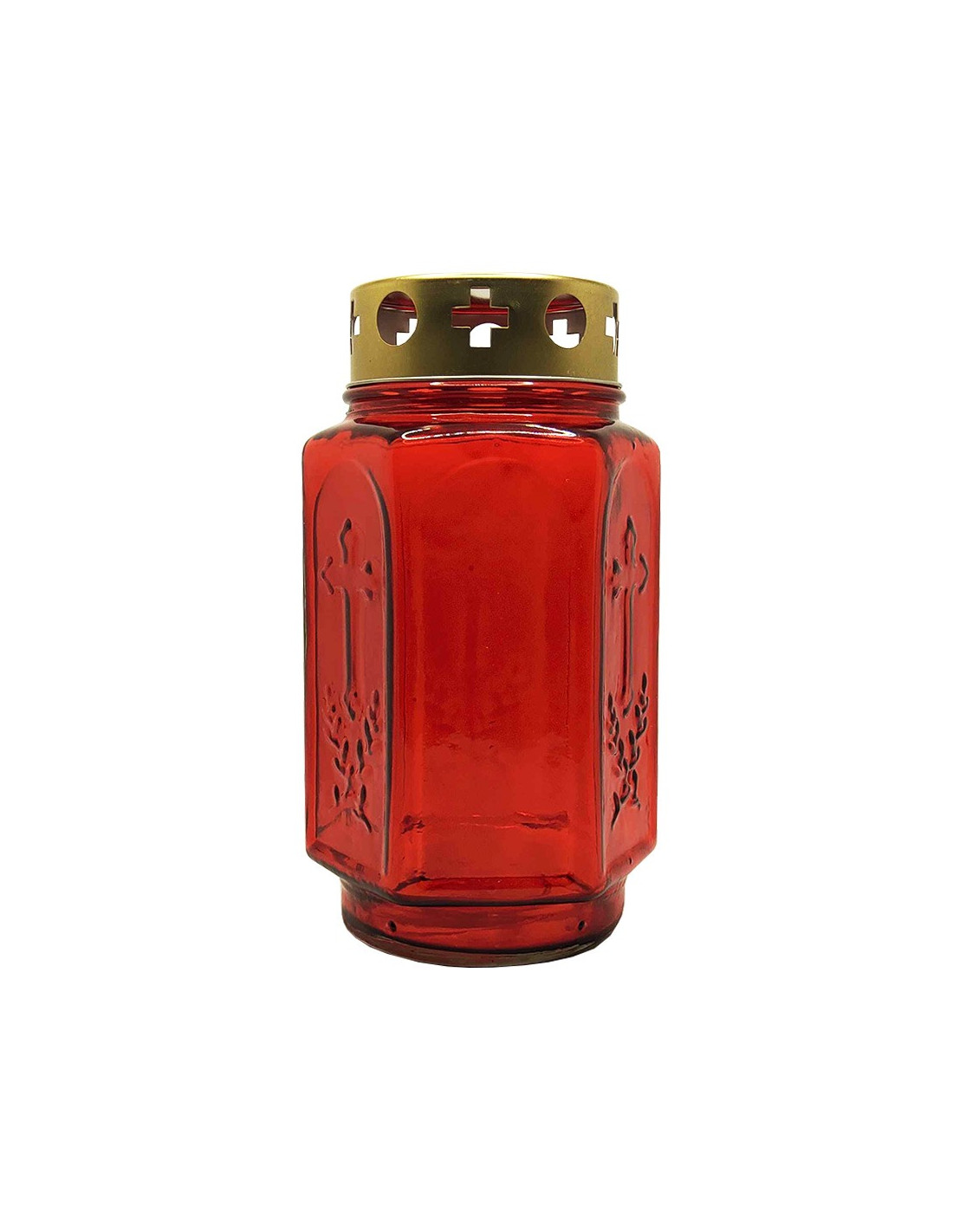 Pequeña lámpara de cementerio de cristal rojo, con tapa metálica cobreada que protege la llama del viento y la lluvia.