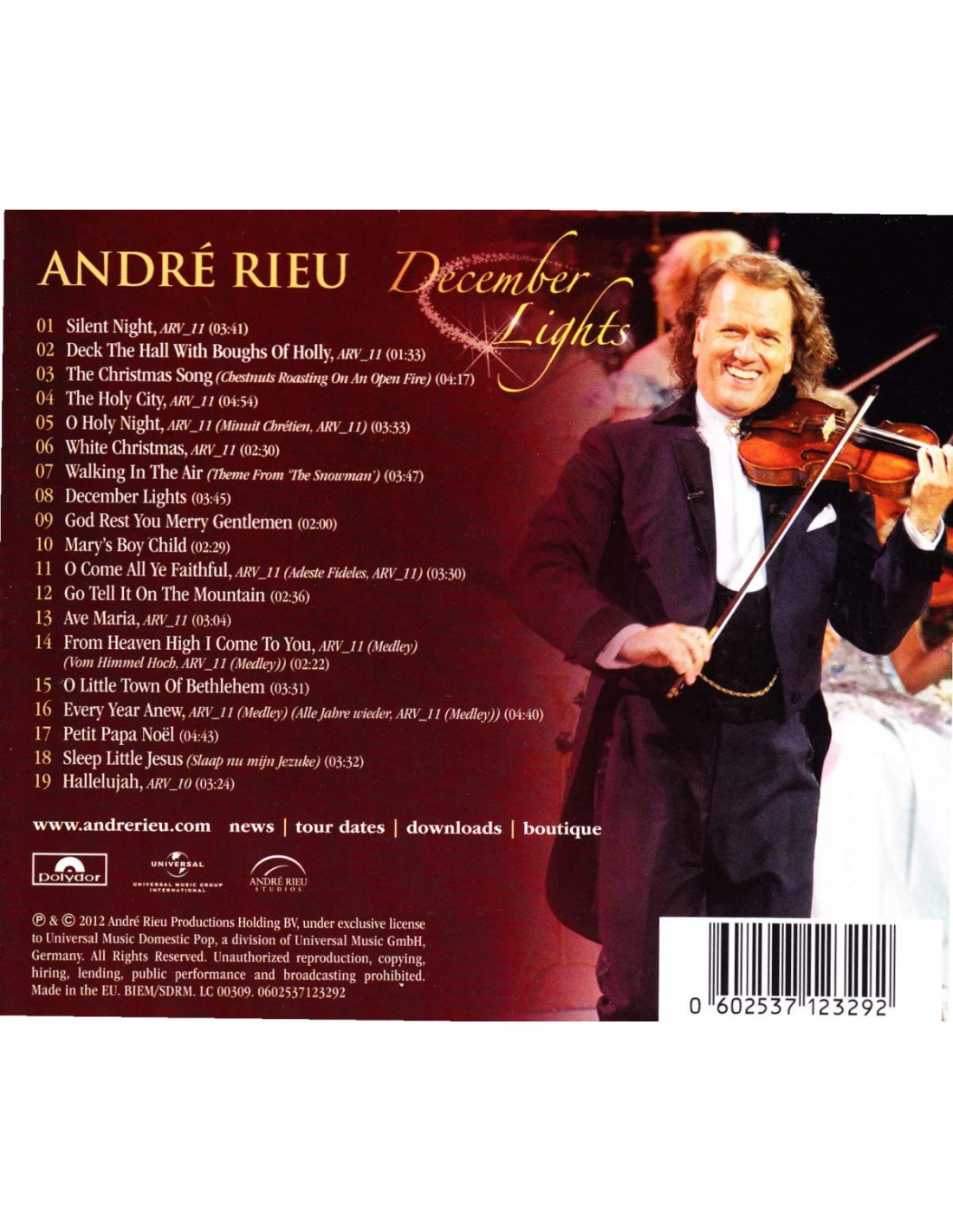 Un CD con 19 piezas de música cubiertas por André Rieu y una orquesta sinfónica para un ambiente navideño aún más mágico con estas dulces y encantadoras canciones y melodías!