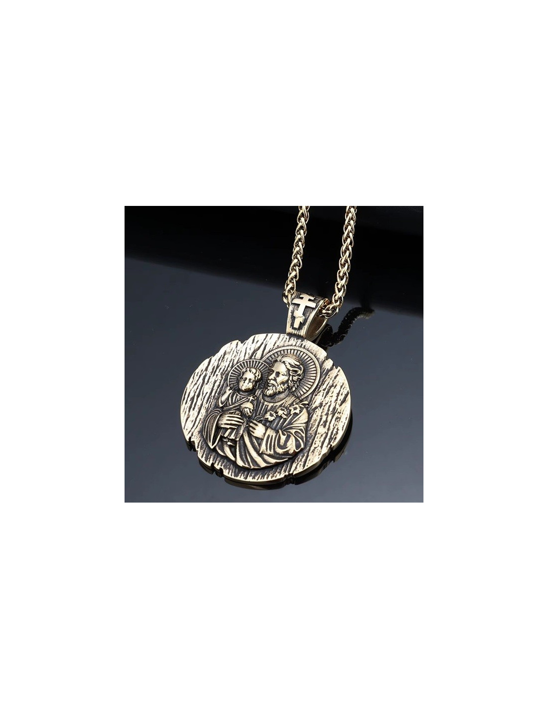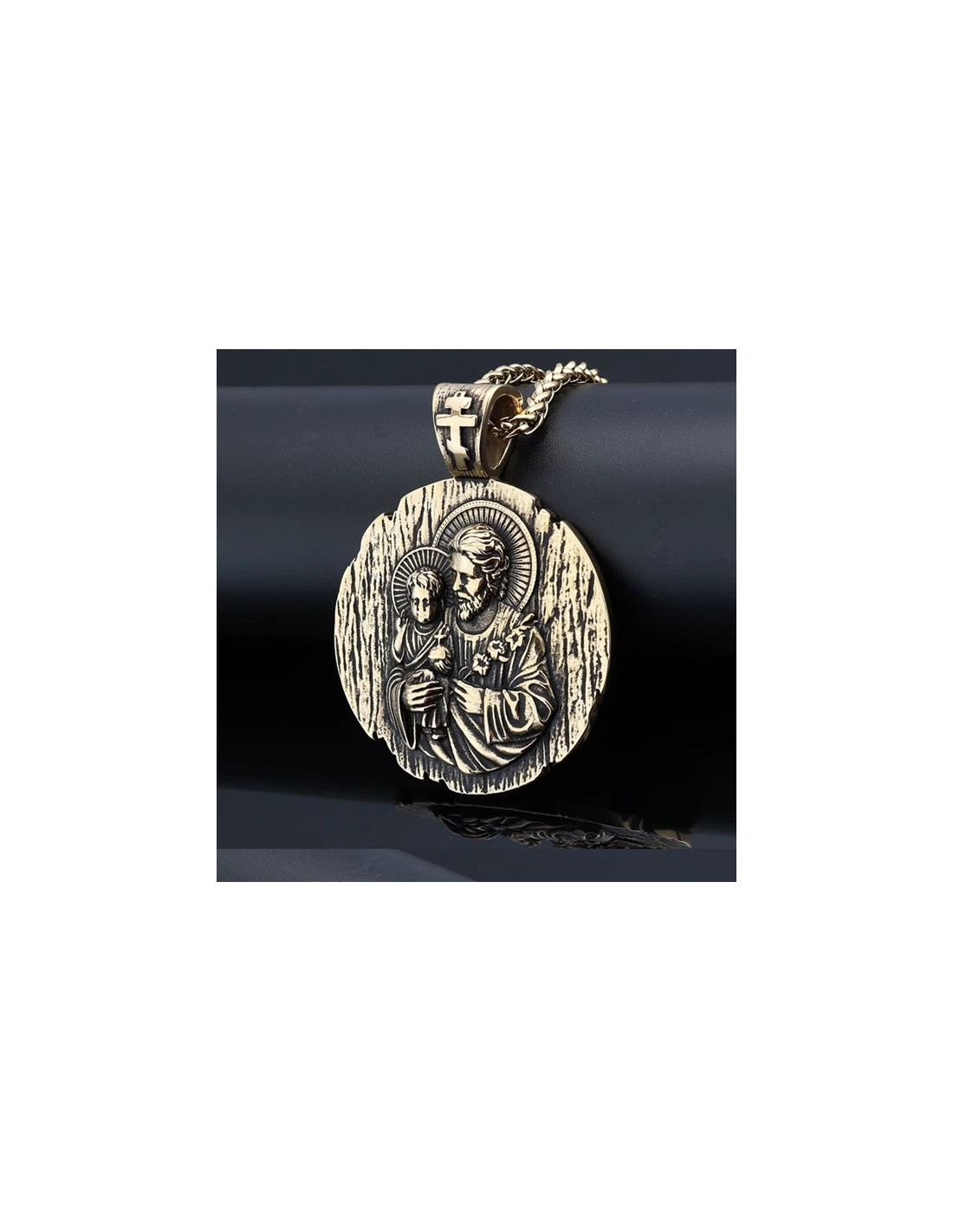 Medalla grande de San José en acero inoxidable con cadena chapada en oro de 18 K - Diámetro 44 mm