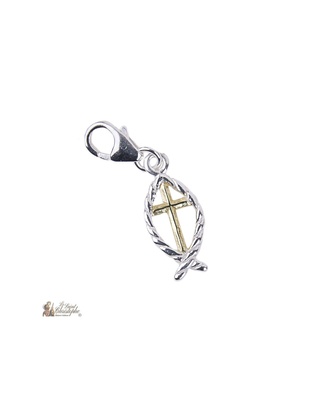 Este colgante de plata 925 alterna delicadamente la plata y el oro. El exterior plateado del pez, con efecto trenzado, contrasta con el oro de la cruz del interior. El pez, dibujado así con los dos arcos de círculos, es un símbolo cristiano católico de protección. El mosquetón te permite colgarlo donde quieras. Le aconsejamos que lo haga bendecir para reforzar su efecto protector.