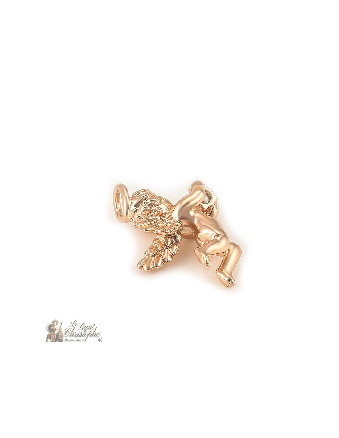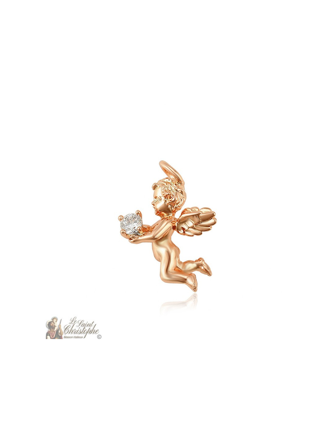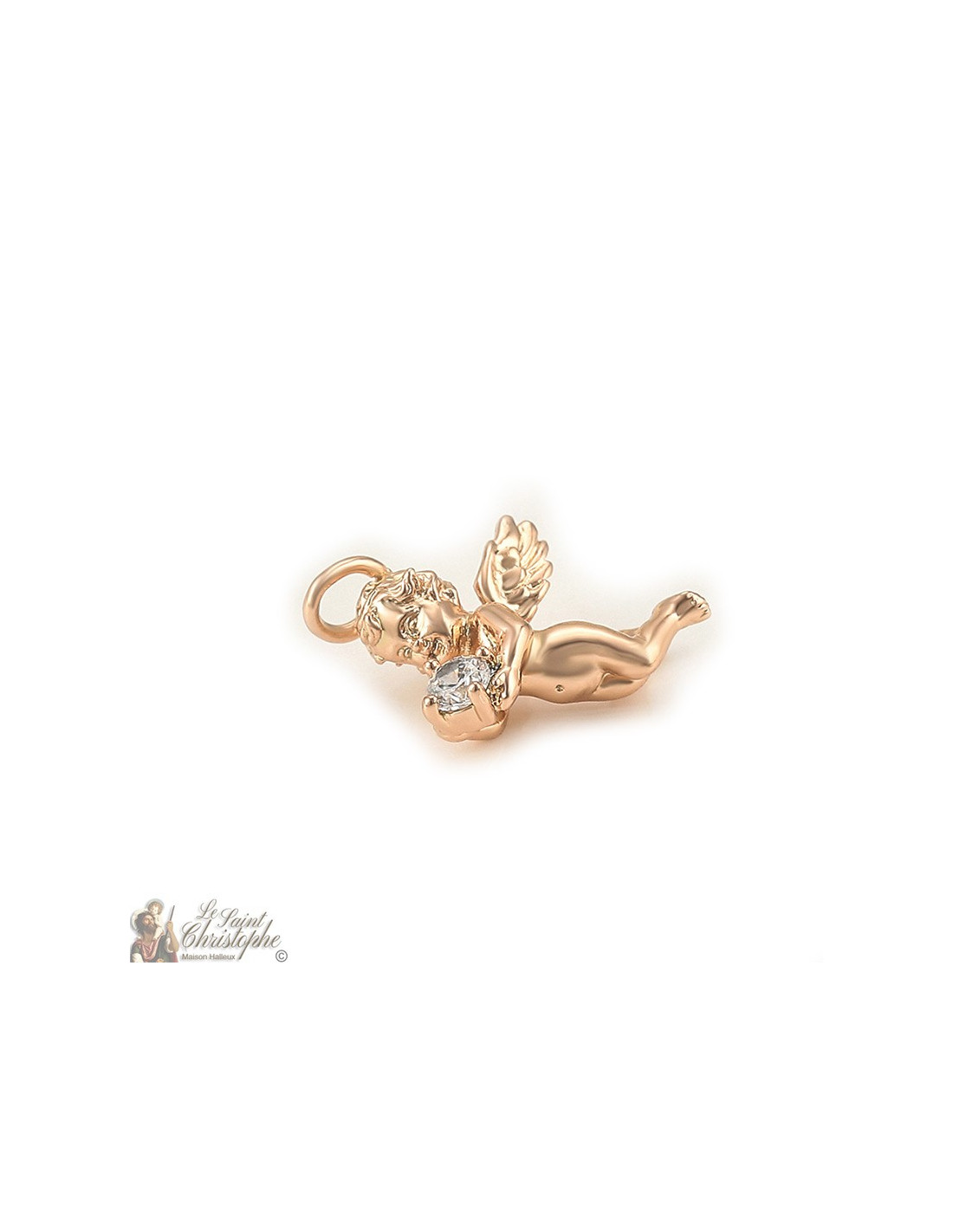 Discreto y brillante, este colgante representa un querubín que sostiene un cristal. Con su color dorado ligeramente rosado, el pequeño querubín puede combinarse con una amplia gama de cadenas y collares.