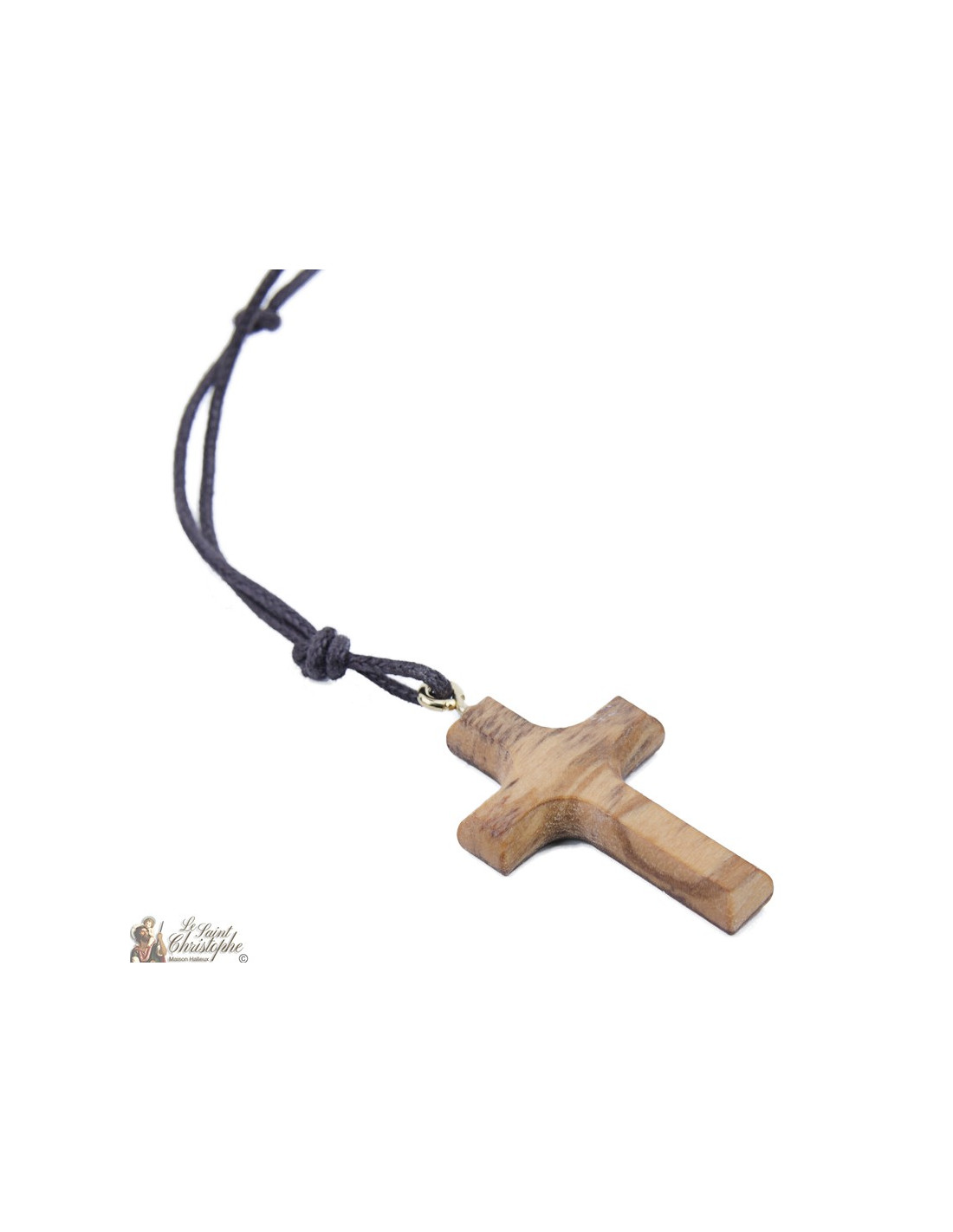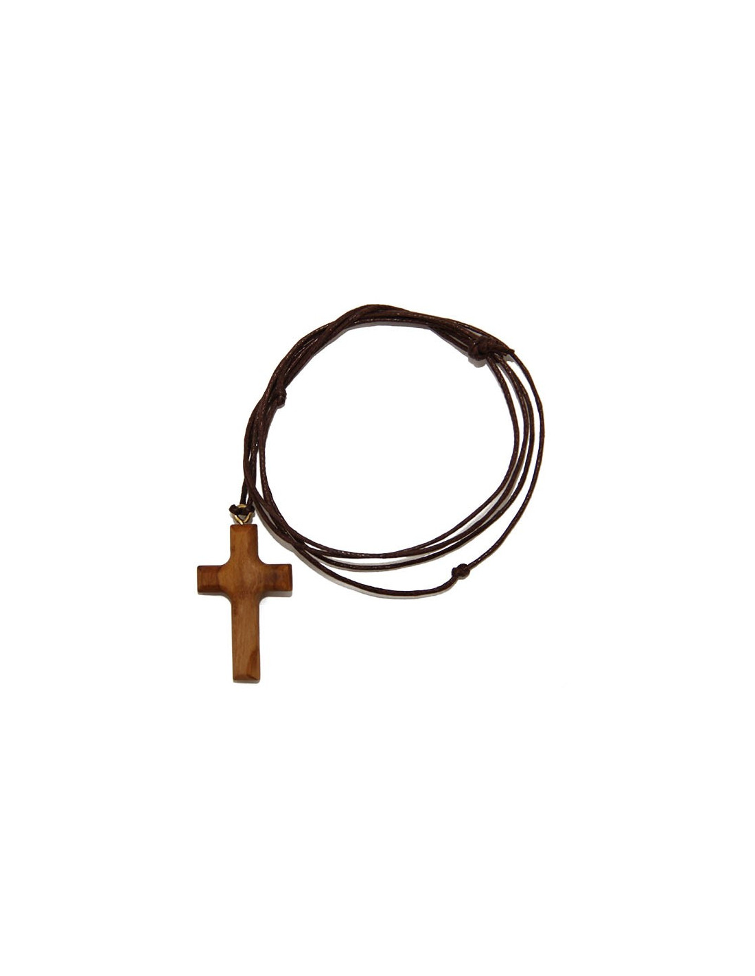 Collar con colgante de cruz de madera de olivo, hecho a mano. El cordón permite tener una longitud ajustable del collar.