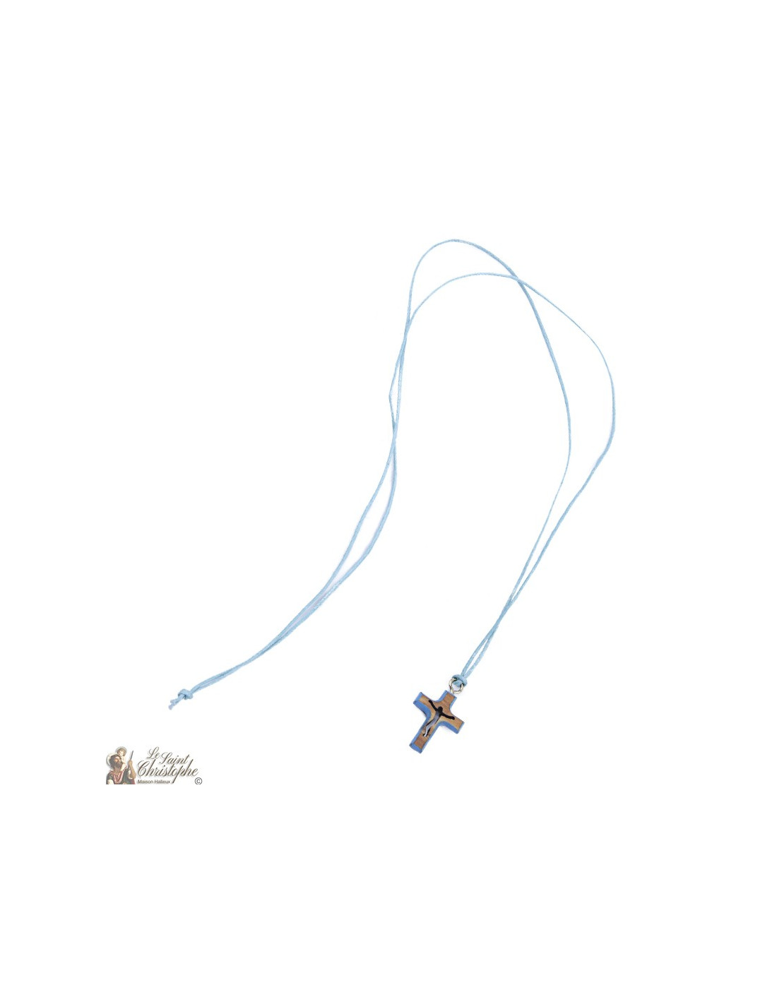 Collar con cordón ajustable y colgante de madera de olivo. El cordón y los bordes del colgante, una cruz, están pintados de azul. El interior de la cruz está tallado en la imagen de Jesucristo crucificado.