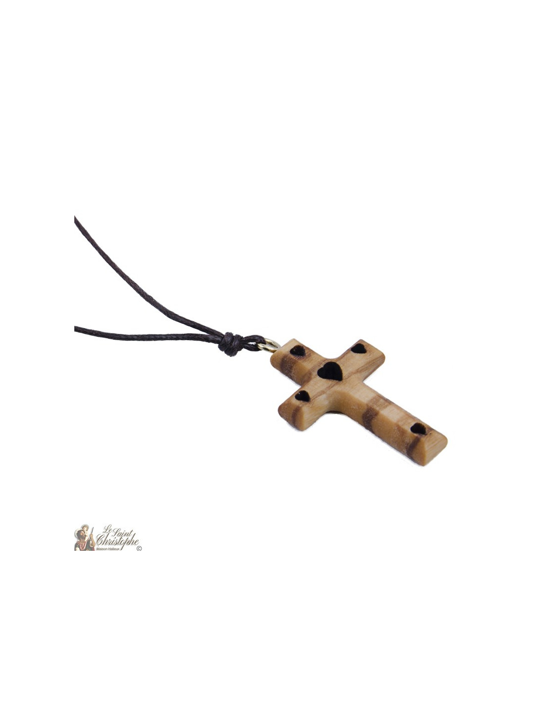 Collar de cordón con un colgante de madera de olivo. El colgante es una delgada cruz de madera que ha sido tallada en varios lugares con pequeños corazones con bordes interiores pintados de negro.