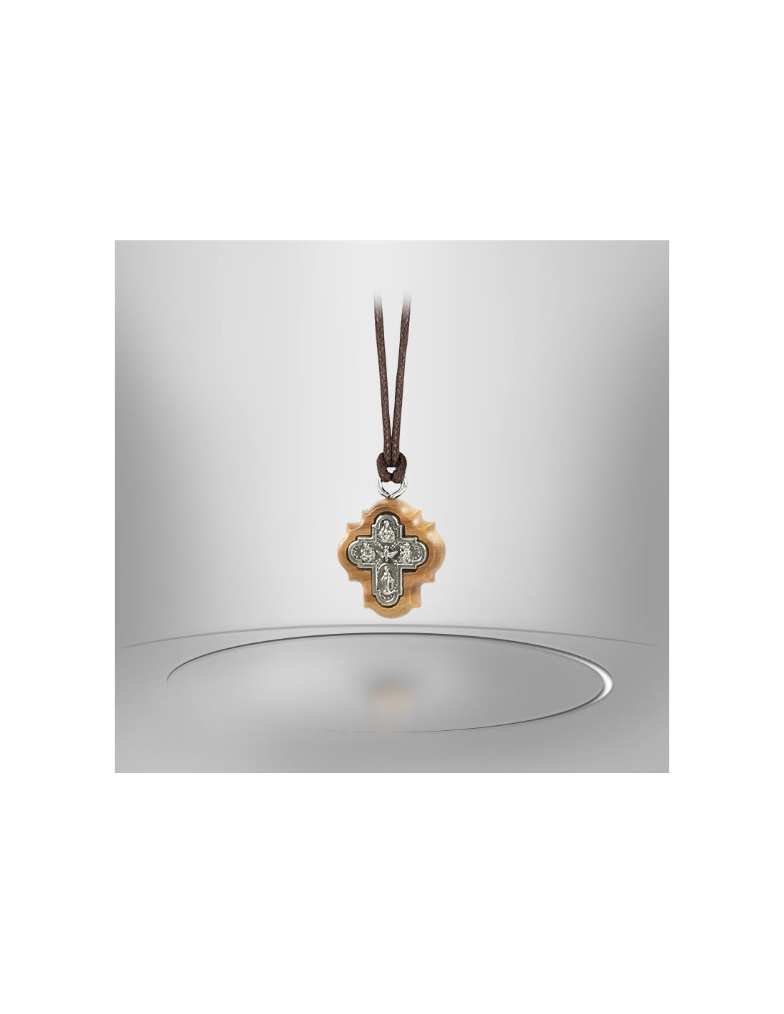 Collar con colgante de madera de olivo y cruz de metal que representa al Espíritu Santo y a los Santos Protectores. El cordón de cuero es de un marrón oscuro que contrasta bien con el color claro de la característica madera de olivo. La cruz lleva en relieve la paloma del Espíritu Santo en el centro, el Sagrado Corazón de Jesús en la parte superior, San José a la izquierda, San Cristóbal a la derecha y la medalla de la Virgen Milagrosa en la parte inferior.