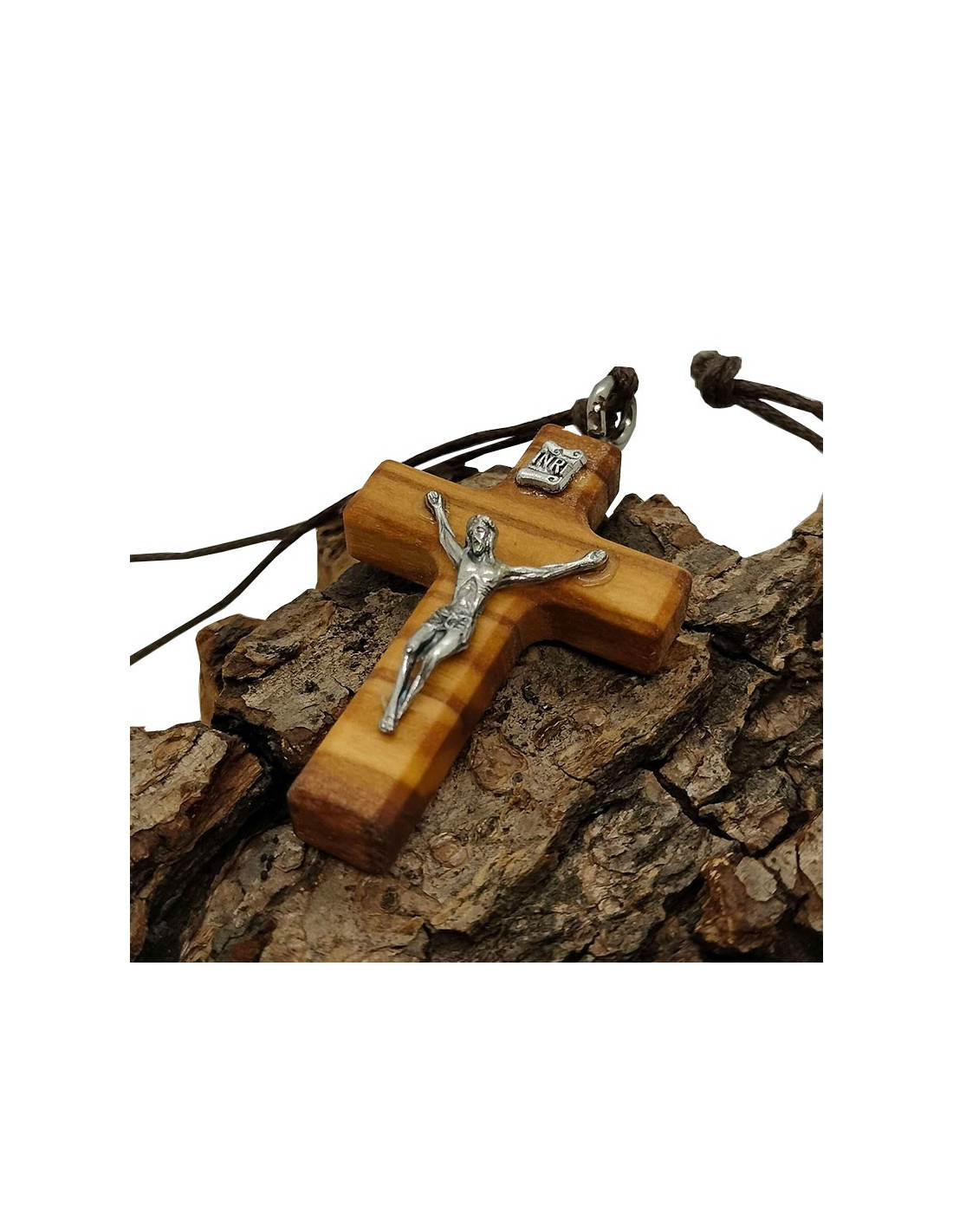 Crucifijo de madera de olivo con Cristo plateado y cordón de cuero marrón.