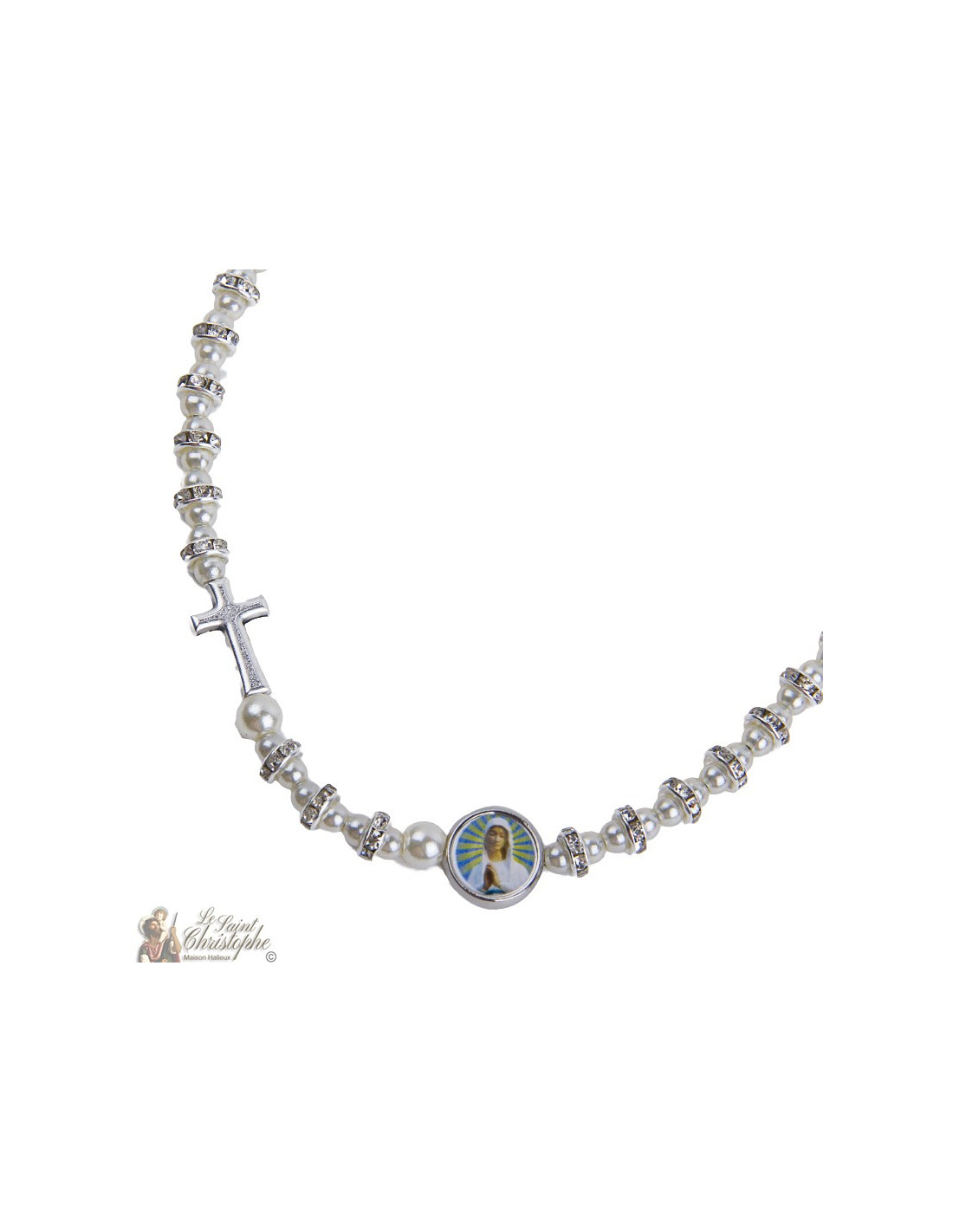 Las cuentas de strass del collar se cruzan con la Virgen de Banneux N.D.
