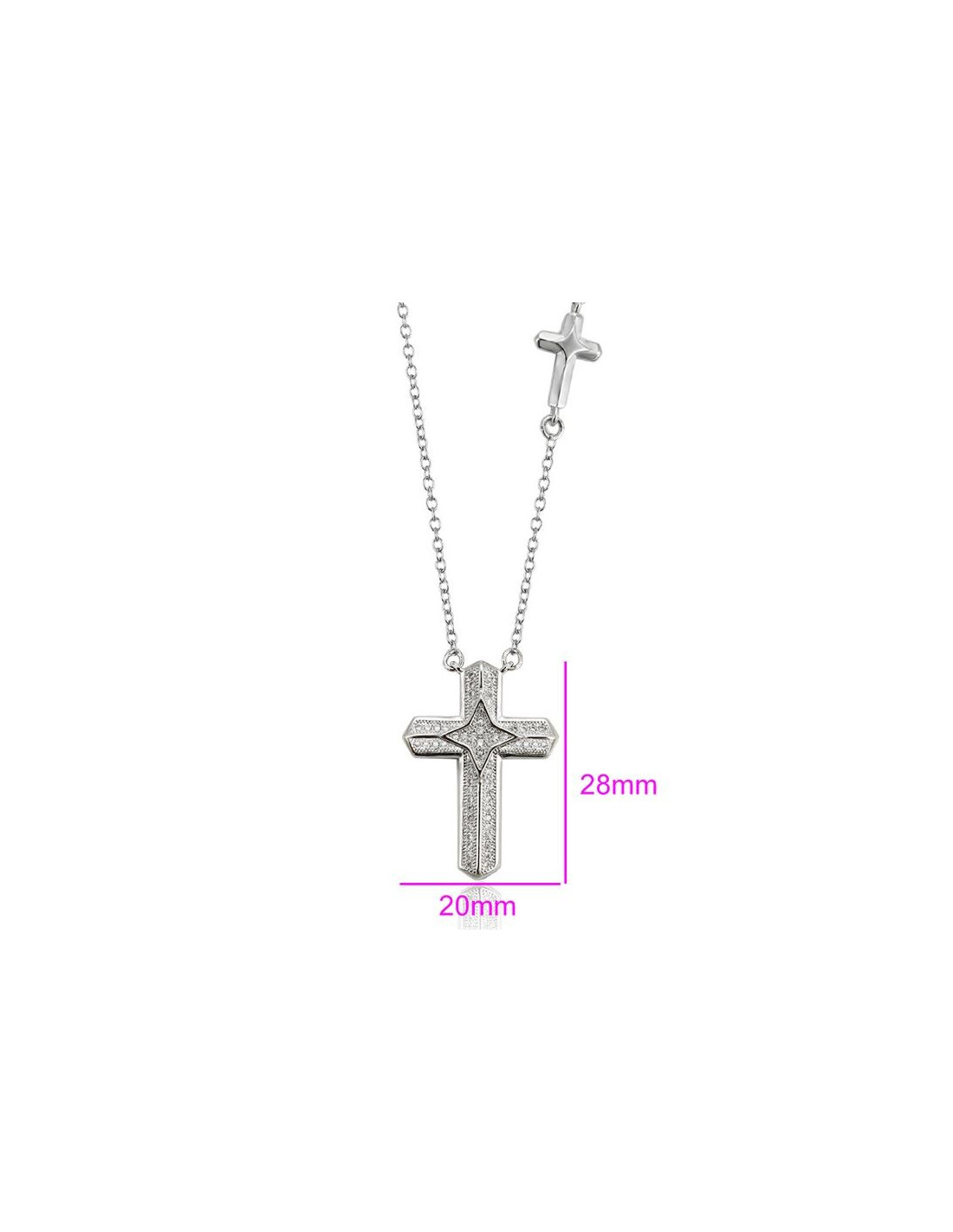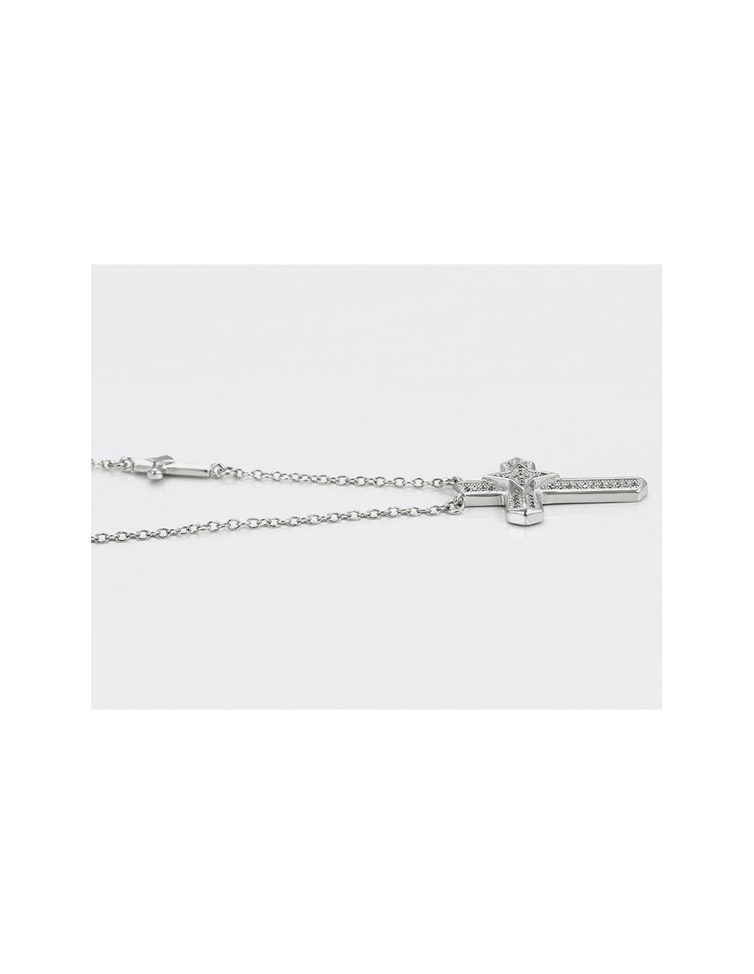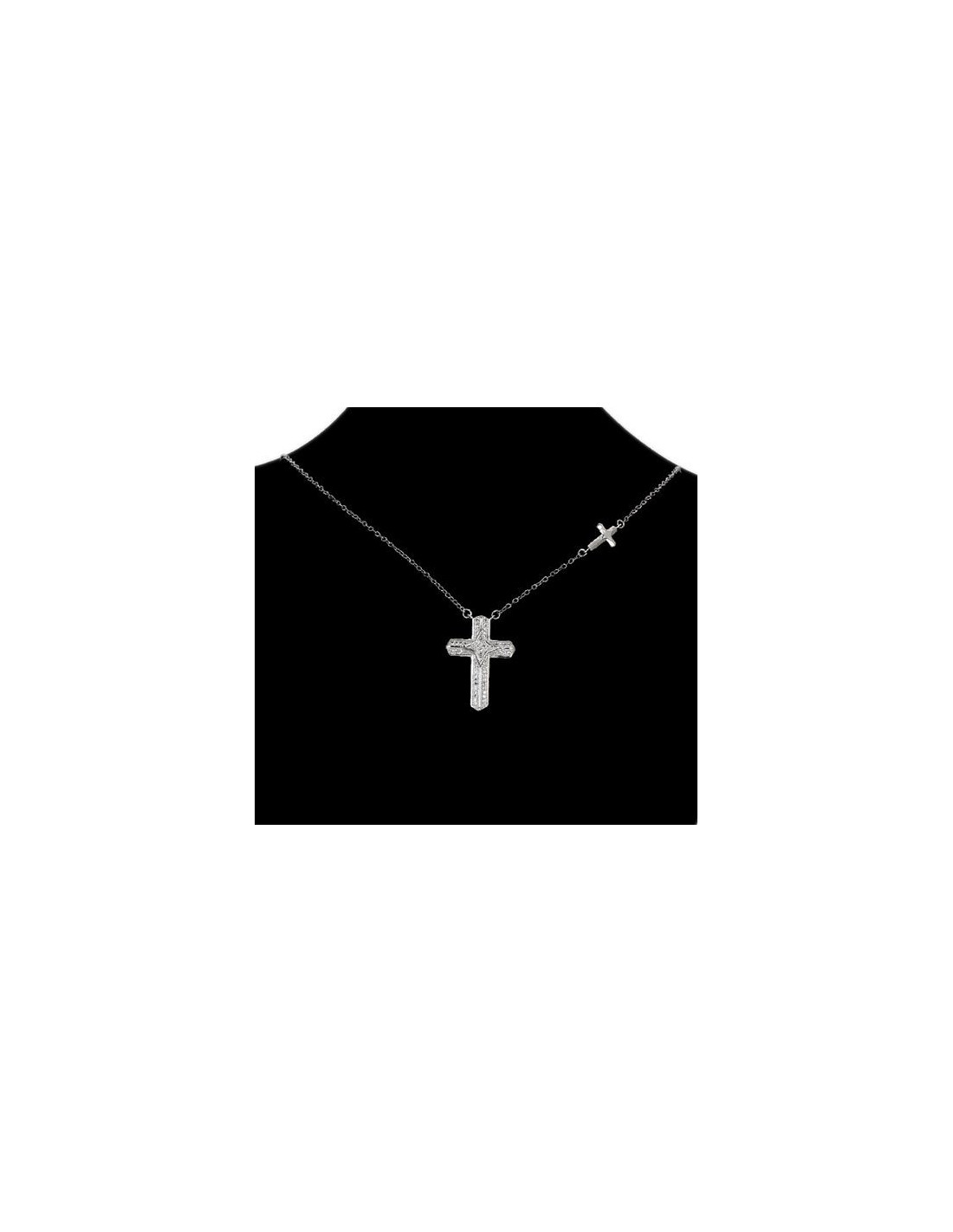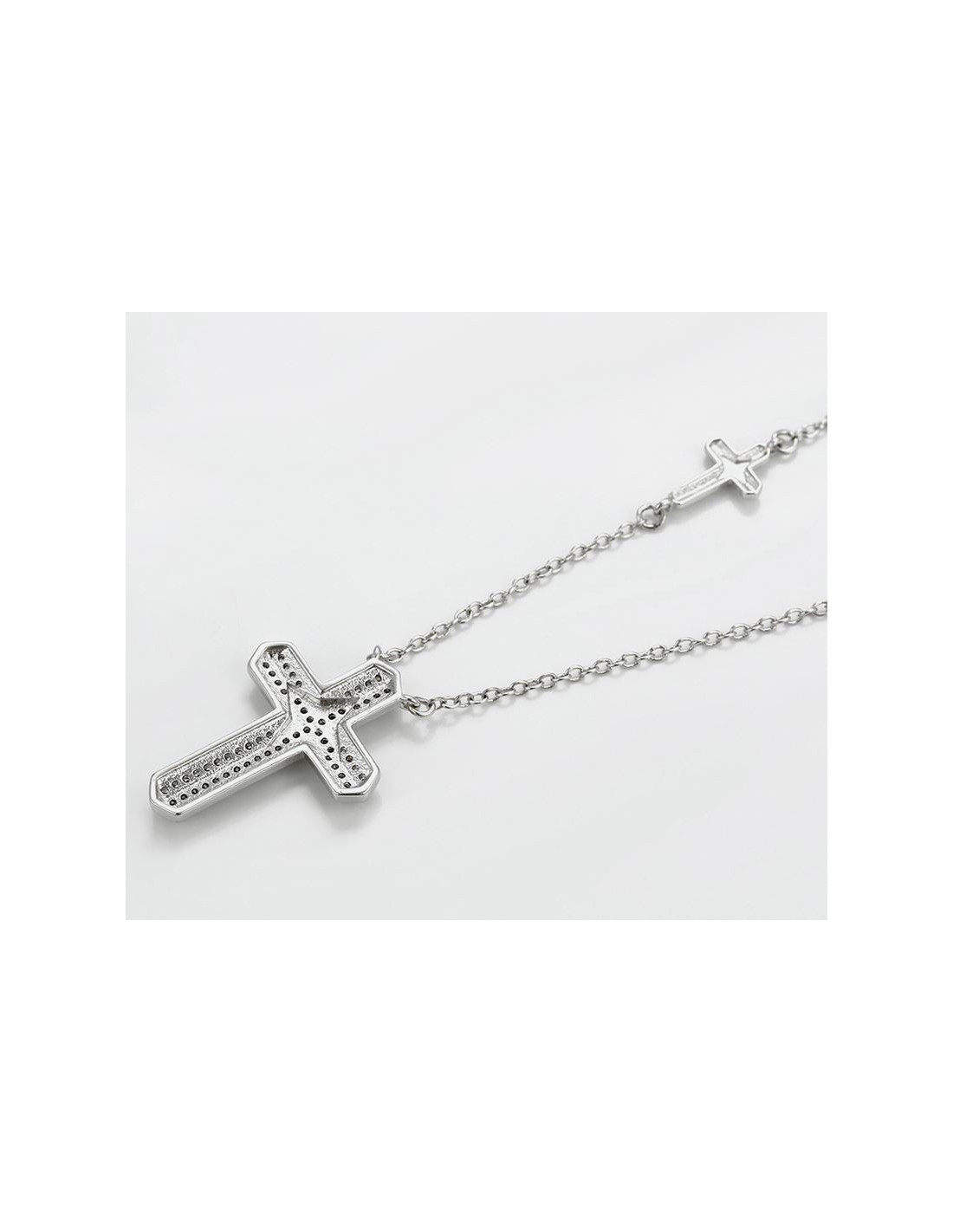 Collar de cobre-rodio, aspecto de metal plateado, con dos colgantes de rodio. Los colgantes son dos cruces, la pequeña está integrada en la cadena, la grande está suspendida como el colgante principal. Este último tiene incrustaciones de cristales sintéticos de CZ (Swarovski).
