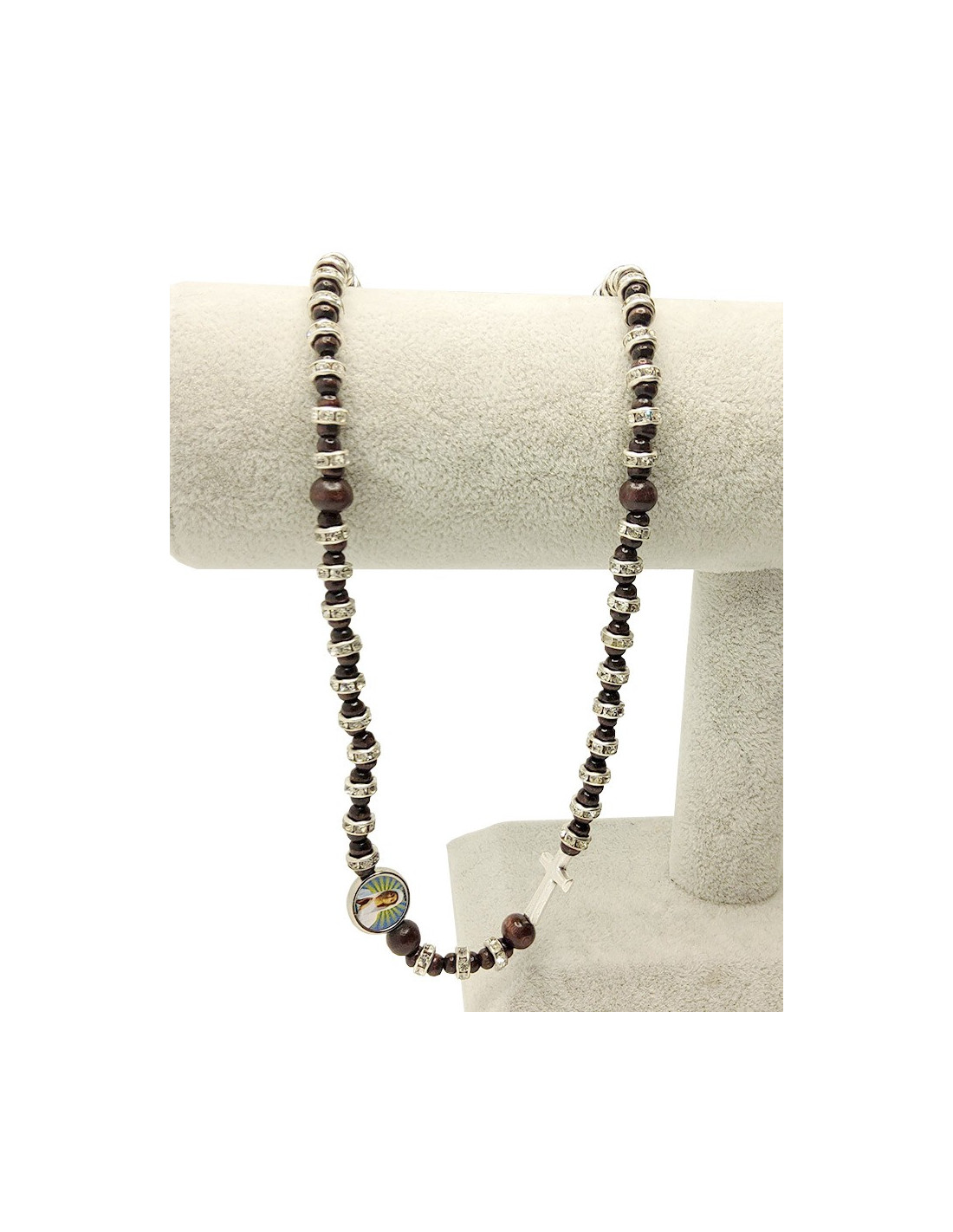 Este collar rosario combina la calidez de la madera con los reflejos luminosos de las cuentas de strass. La cruz plateada añade un toque elegante. El cabujón representa a la Virgen de los Pobres, tal como apareció en Banneux Notre-Dame (Bélgica). Esta joya espiritual puede llevarse a diario o utilizarse como rosario. Es ideal como recuerdo de una peregrinación o como regalo simbólico para una comunión o confirmación.