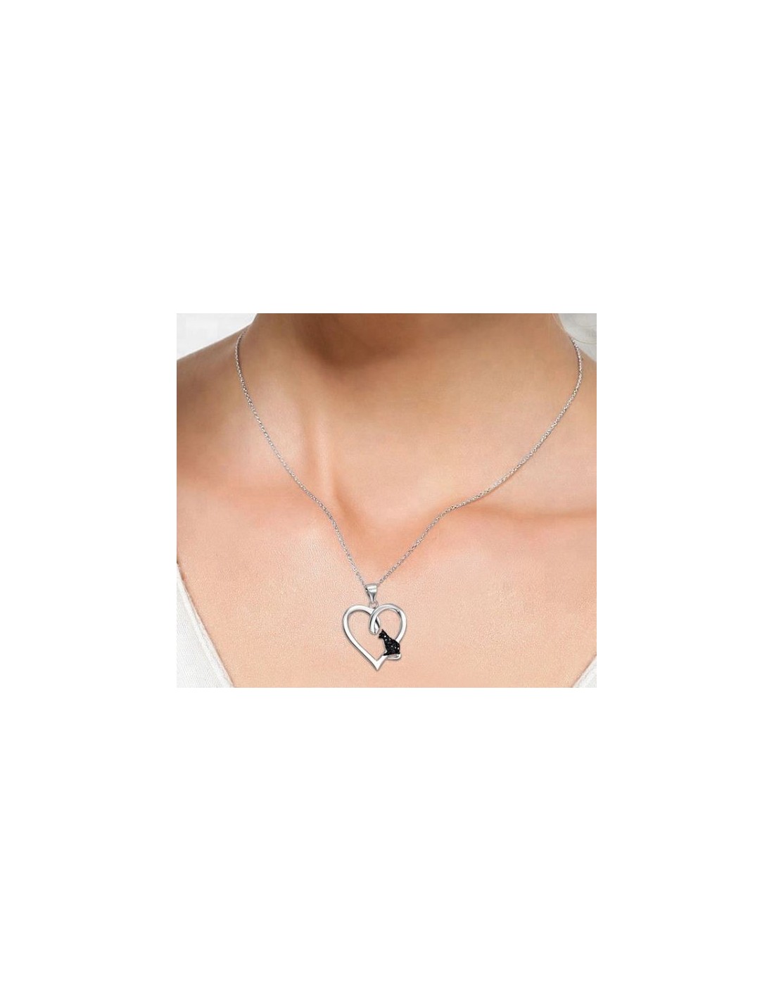 Collar y colgante en plata 925. La cadena es una clásica cadena de eslabones redondos de plata. El colgante tiene forma de corazón con un gato negro en su interior, este último tiene incrustaciones de circones negros.