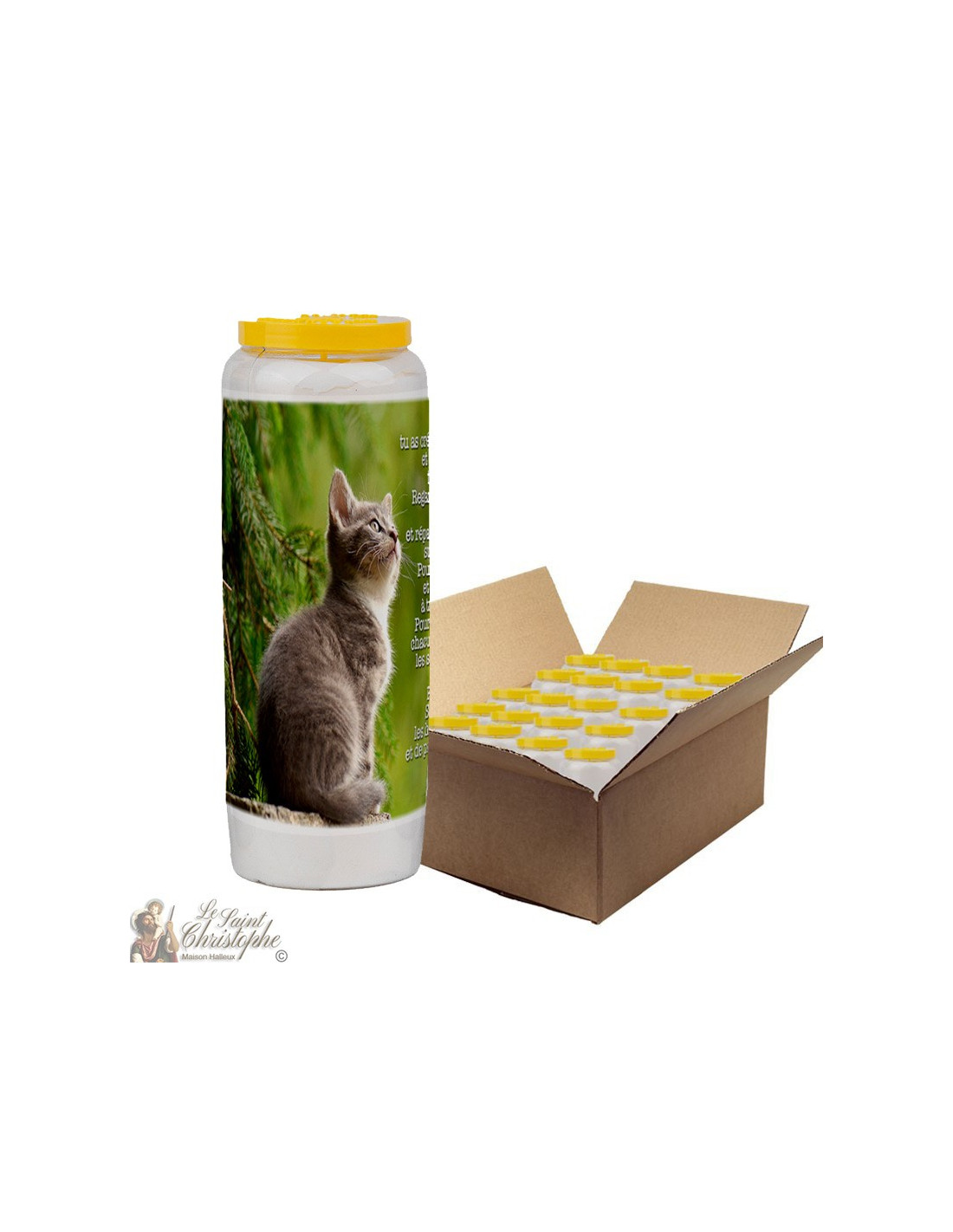 Velas de novena vegetal con la imagen de un gato joven y una oración para todos los animales, para aliviarlos y protegerlos.