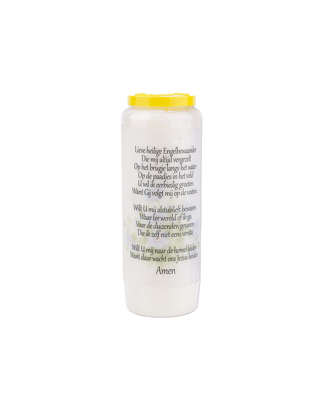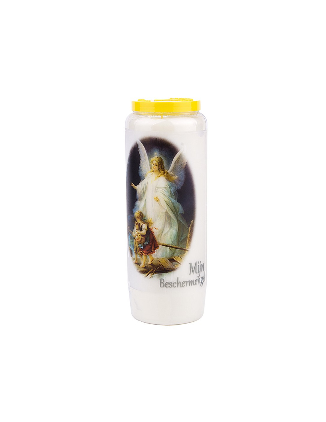 Caja de 20 cirios de novenario blancos con la imagen del Ángel de la Guarda y una oración en el reverso.
