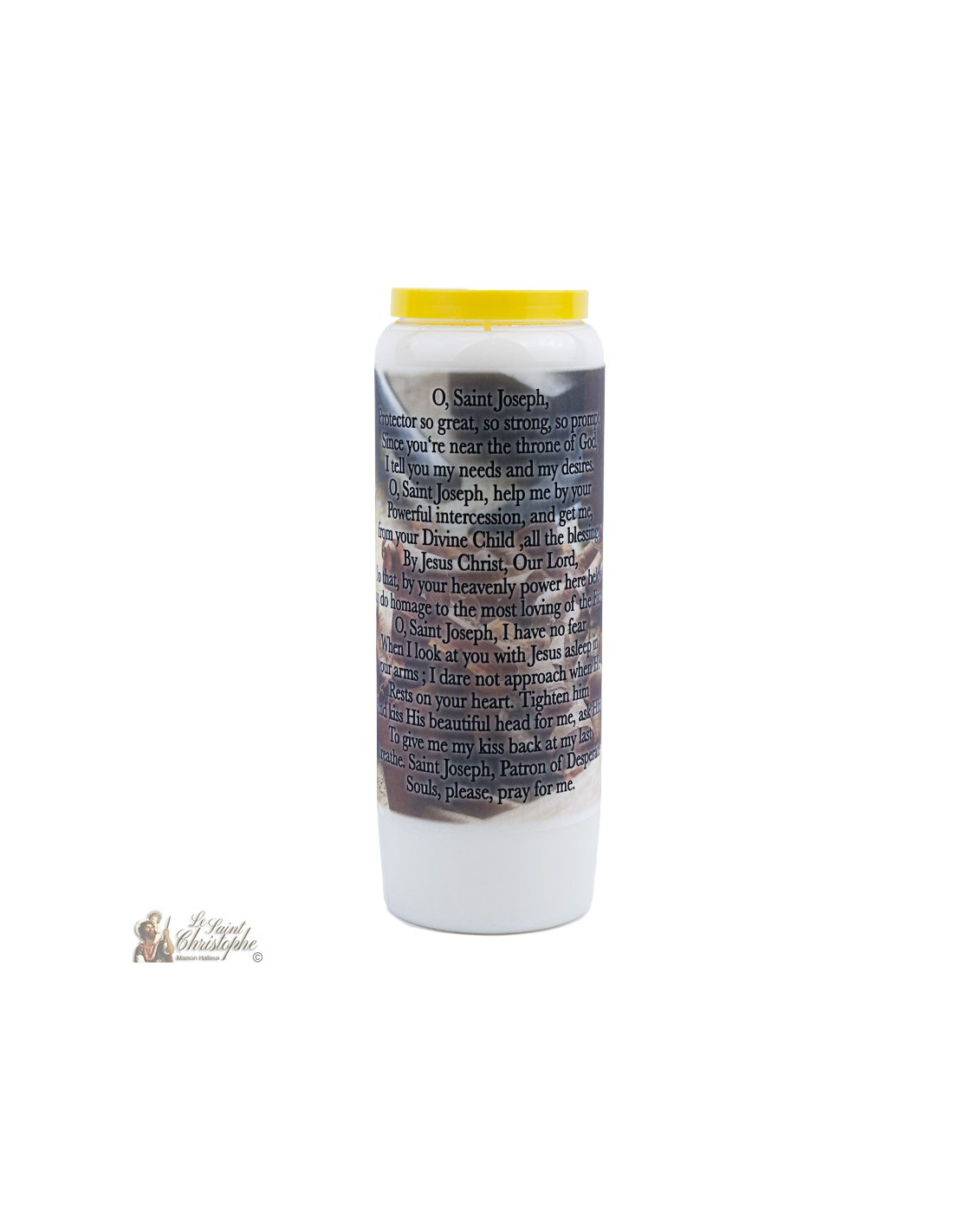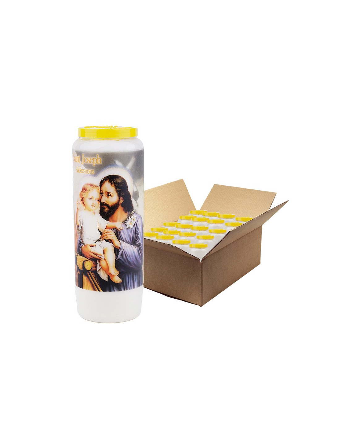 Caja de 20 cirios de novenario con la imagen de San José y una oración en el reverso.