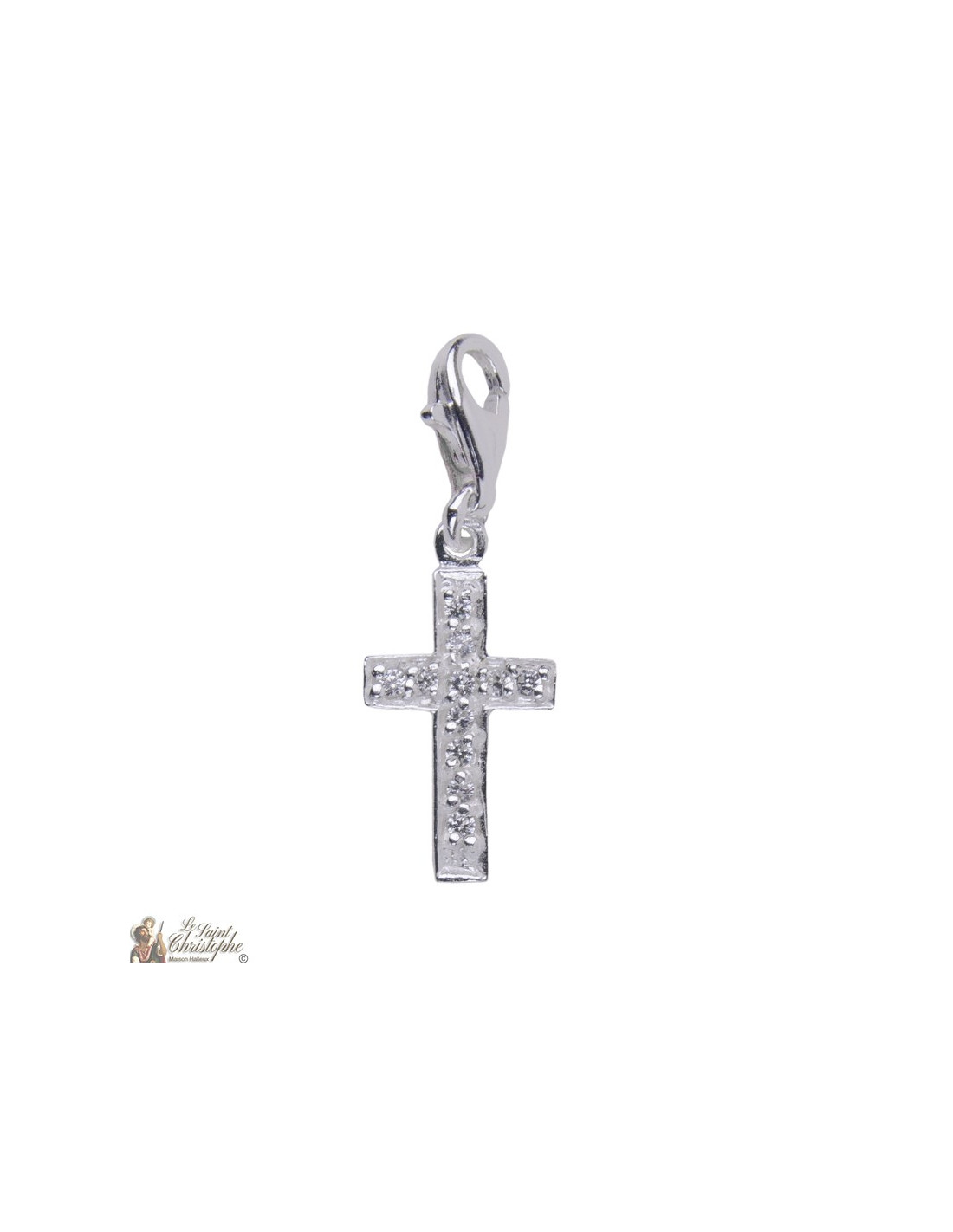 Este colgante de plata auténtica 925 tiene forma de cruz, un modelo sobrio y delicado con incrustaciones de cristales brillantes. Un sencillo colgante que, gracias a su mosquetón, puede colocarse donde quiera.