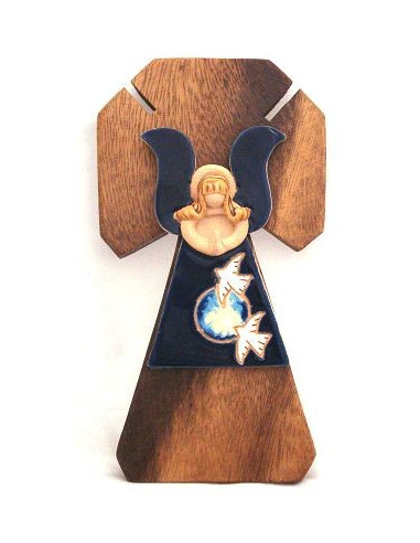 Cruz de pared hecha a mano en madera y terracota esmaltada. Este crucifijo, un producto único hecho a mano en Venezuela, está decorado con un ángel de cerámica esmaltada azul oscuro, dos palomas y un planeta tierra grabados en su manto, mientras que sus brazos y cabeza están esculpidos. Este añadido añade dimensión al ángel que reza con las manos cruzadas. Objeto de arte decorativo y original, esta cruz colgante es magnífica para añadir un toque de espiritualidad y arte mundial a cualquier interior.