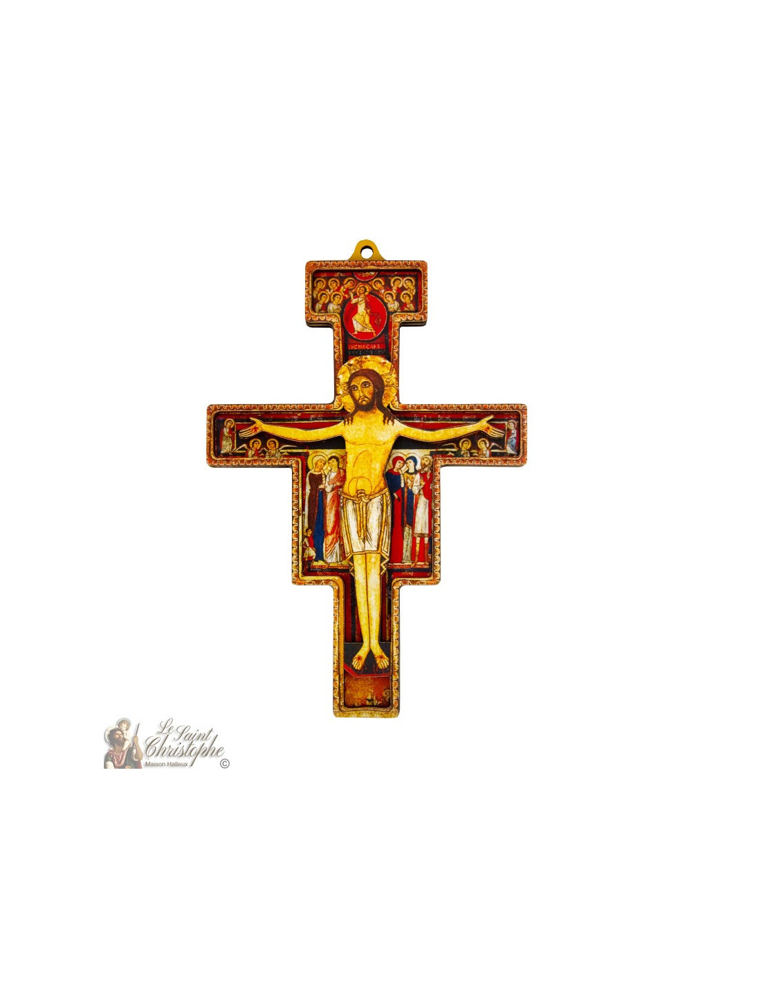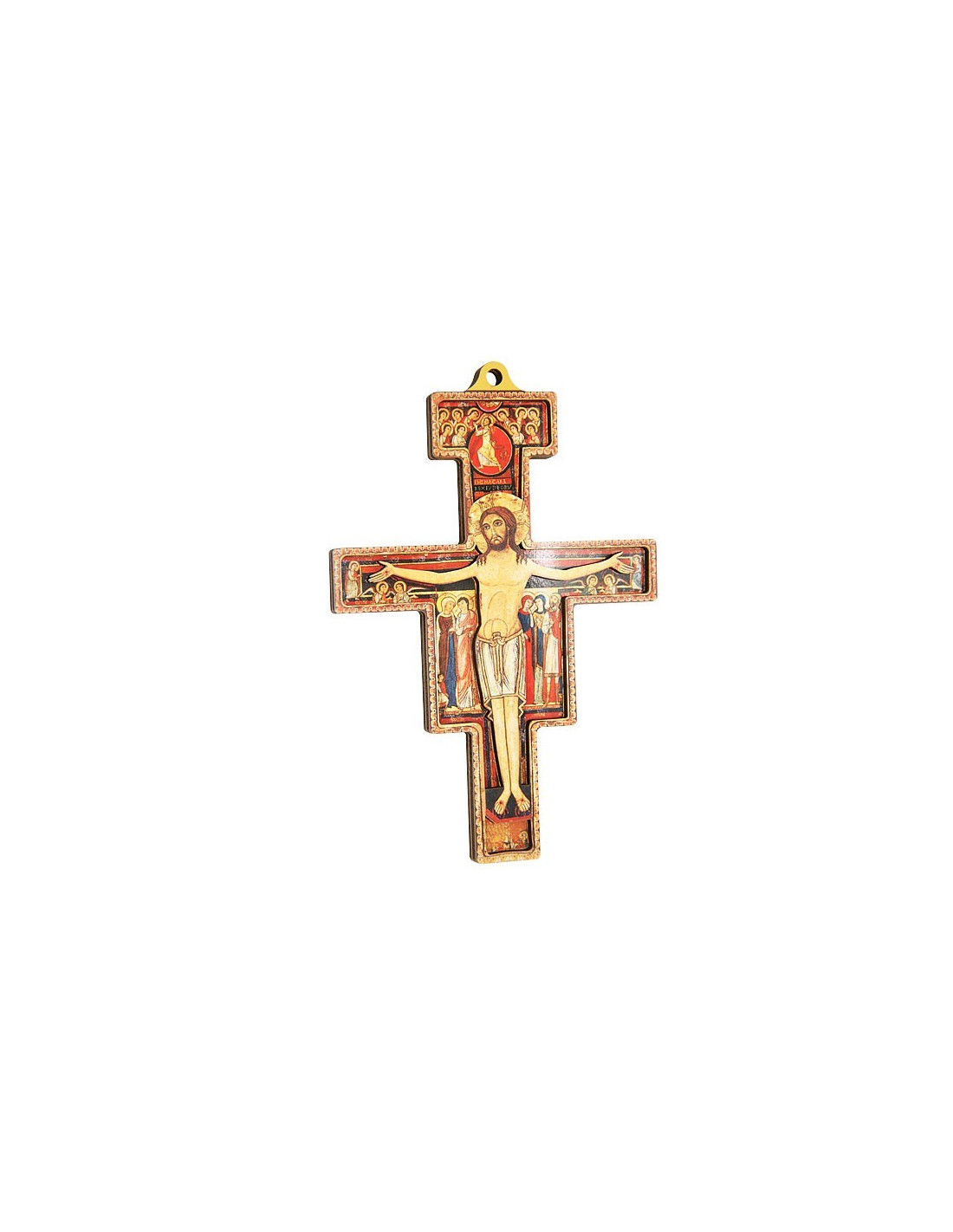 Crucifijo para colgar en la pared, de madera MDF (placas de madera). Esta cruz de San Damián resalta la figura de Cristo gracias a su efecto 3D, un desnivel que separa a Jesús de la decoración de la cruz.