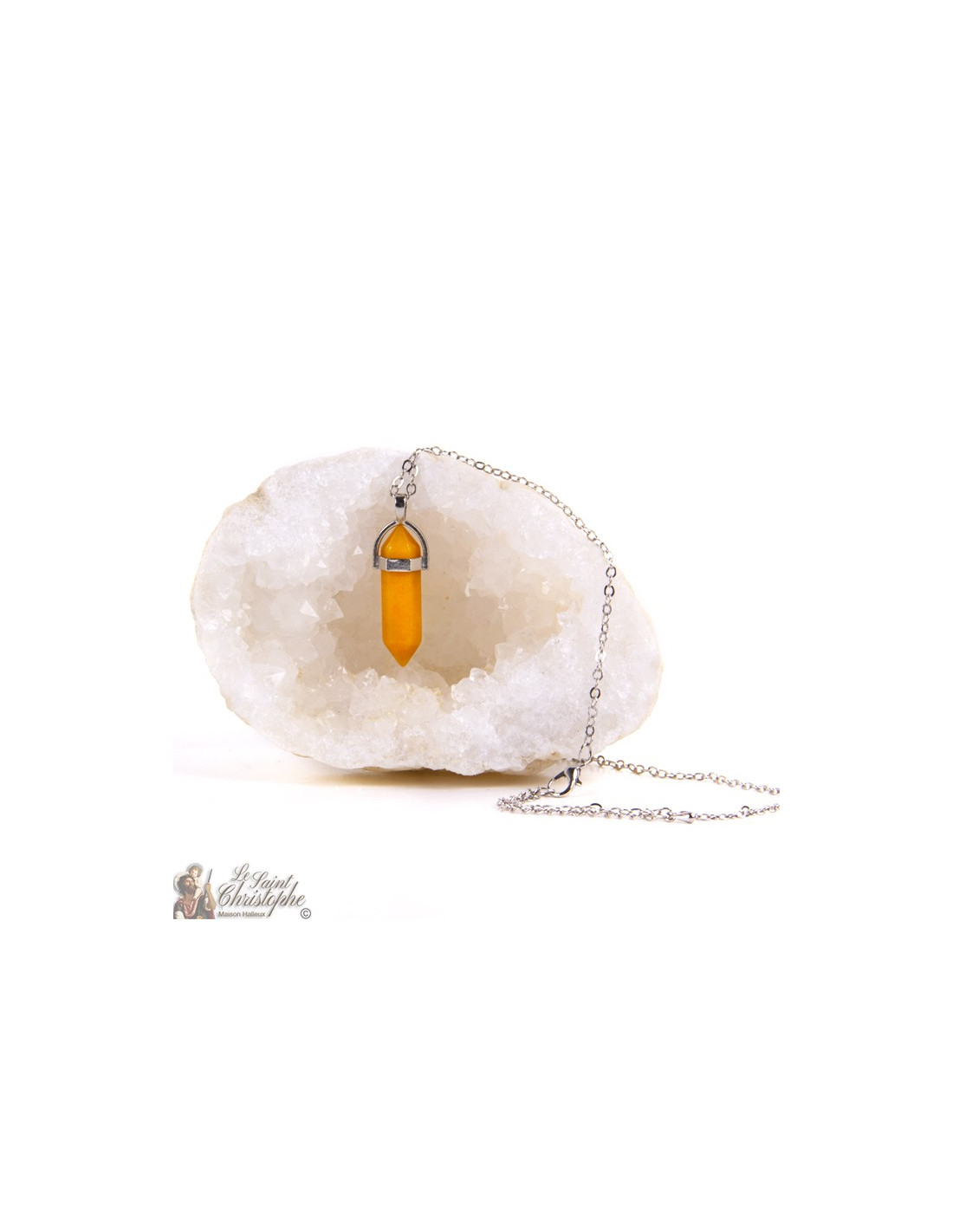 Collar de metal plateado con un colgante de piedra fina, ágata amarilla.