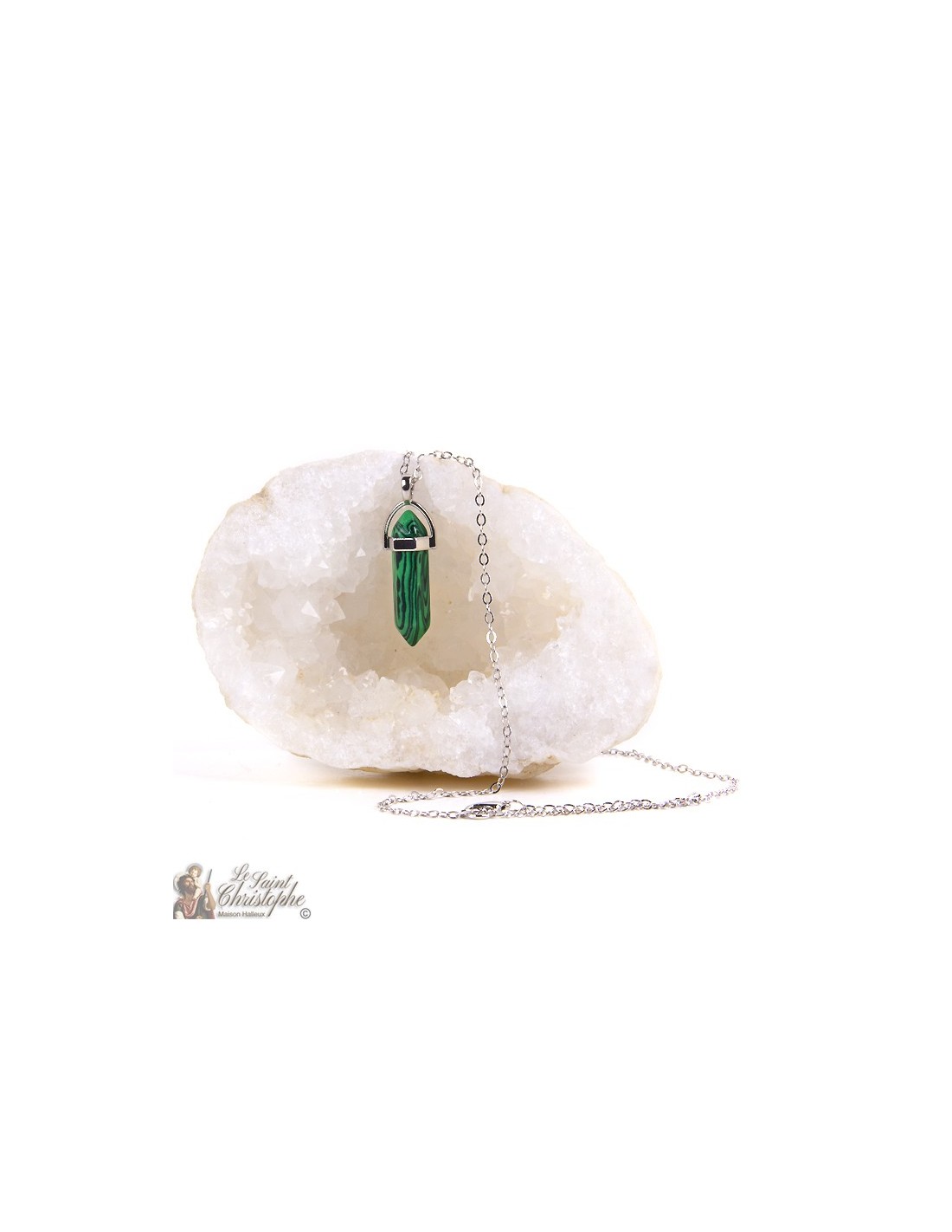 Collar de metal plateado con un colgante de piedra fina artificial hecho de malaquita.