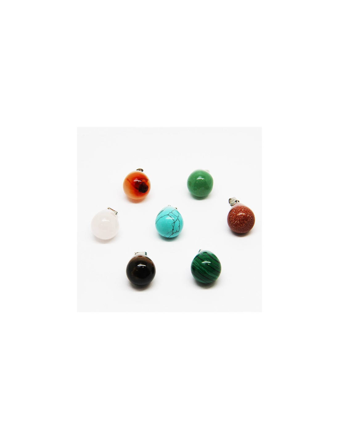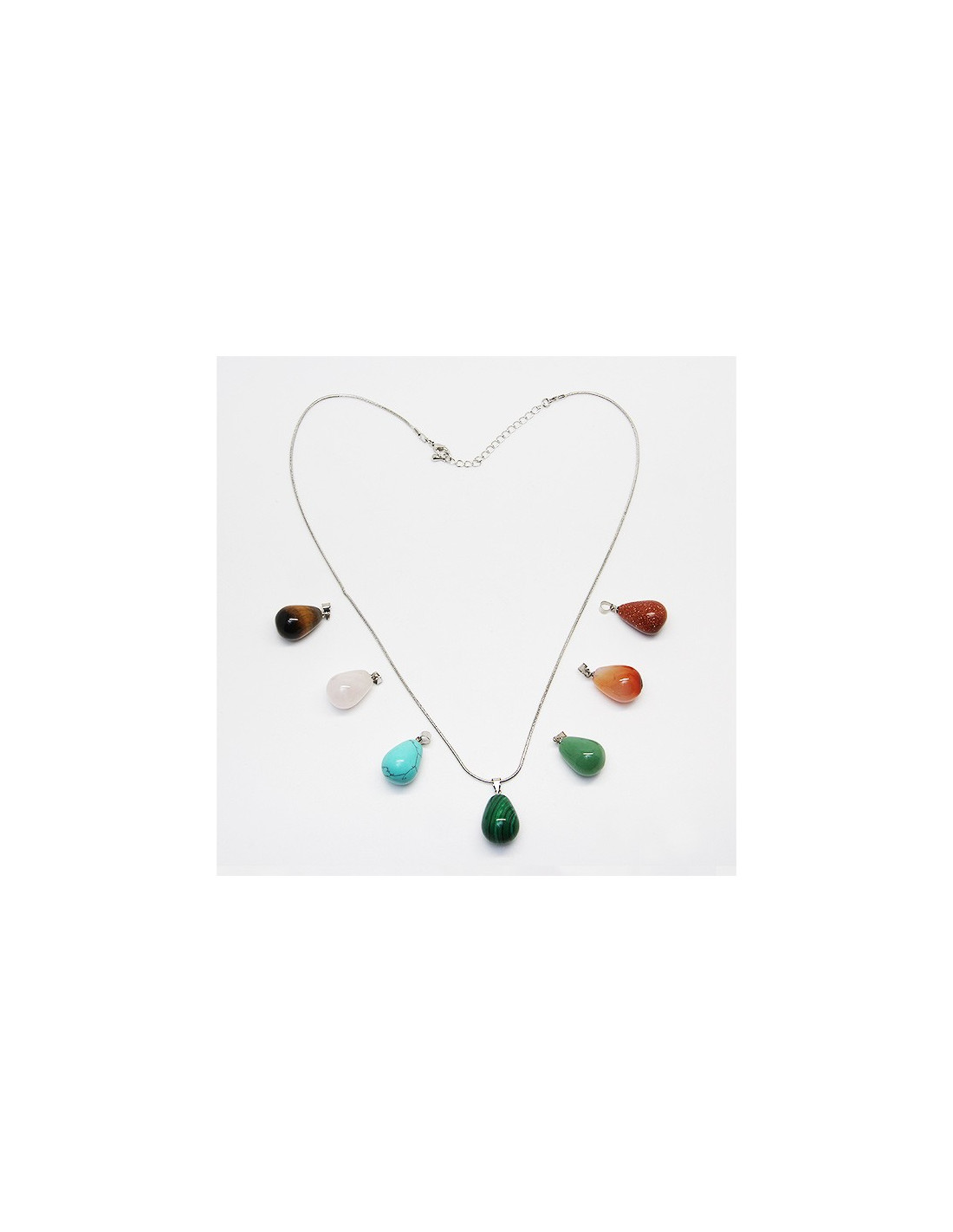 Este collar se suministra con 7 colgantes en forma de pequeñas gotas. Las siete piedras son cornalina, piedra de oro, ojo de tigre, malaquita sintética, aventurina verde, turquesa reconstituida y cuarzo rosa.