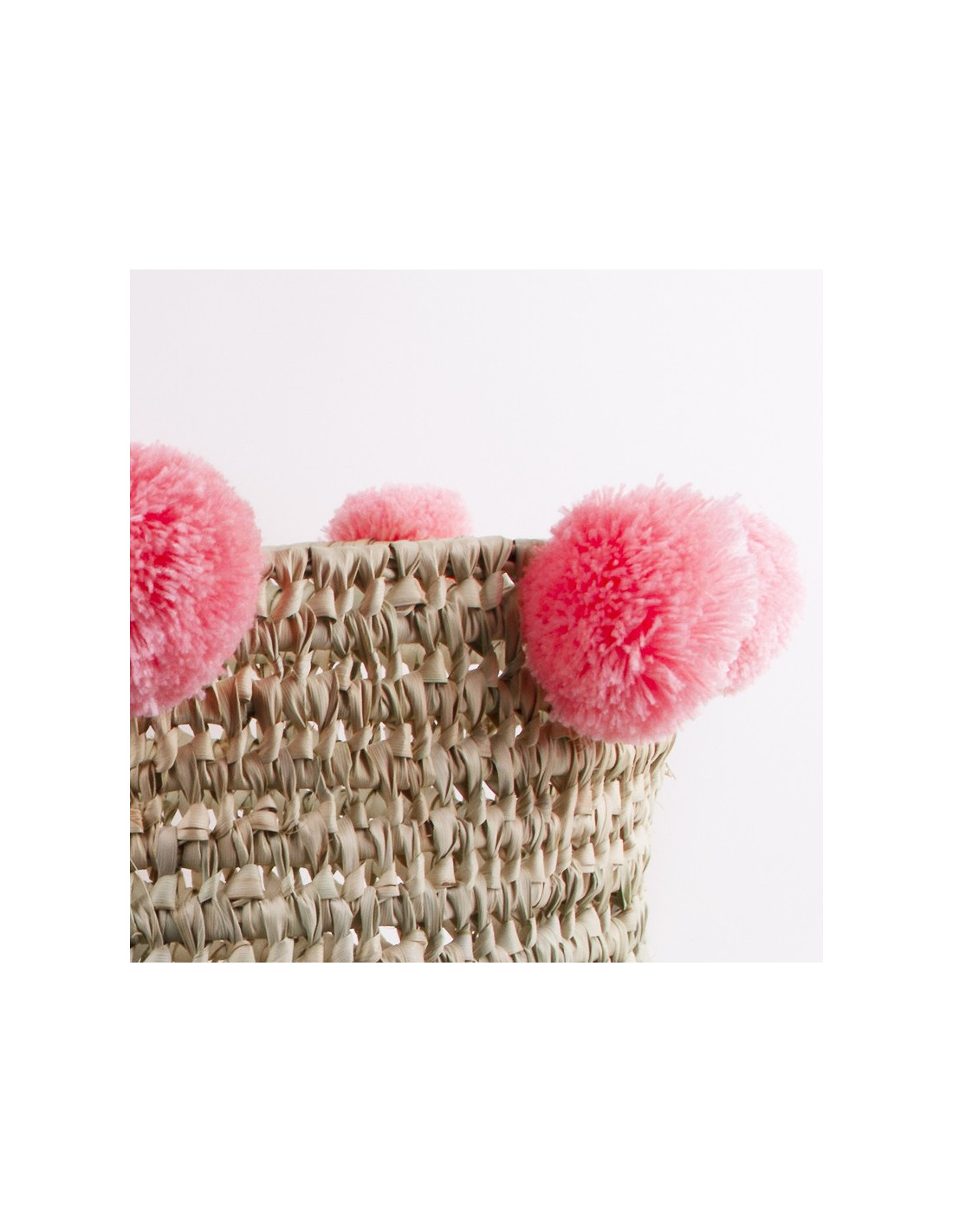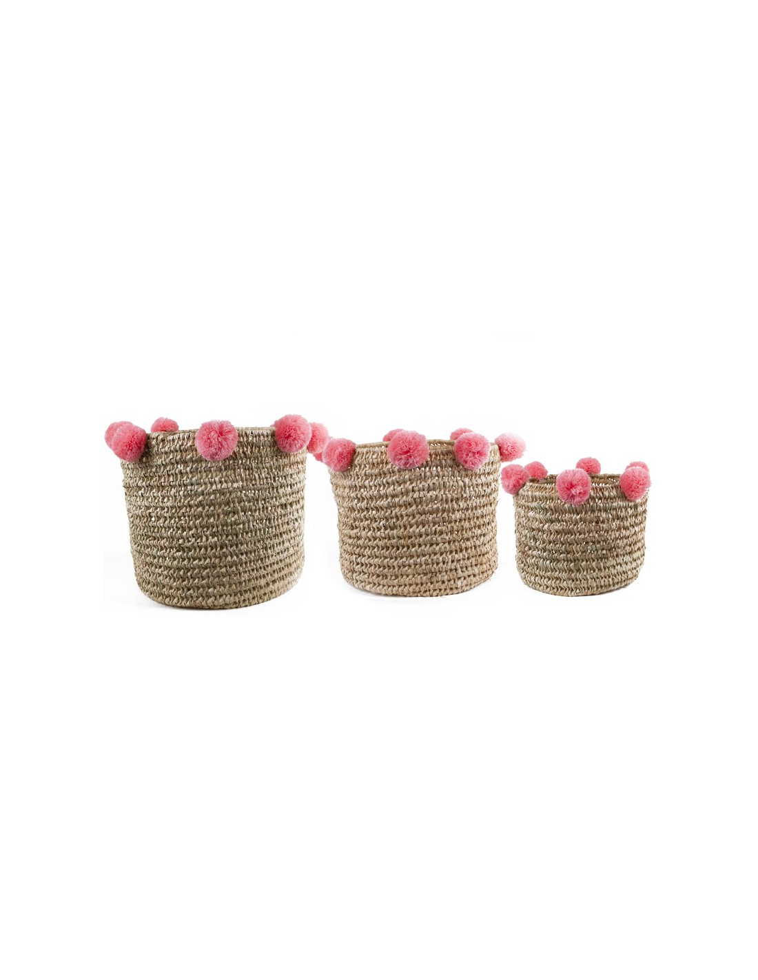 Juego de tres cestas redondas tejidas con borlas. Las cestas son encajables gracias a sus diferentes tamaños. Totalmente hechas a mano, están tejidas con hojas de palma secas, un material más ligero y flexible que el mimbre. Los seis pompones de lana de cada cesta son de un hermoso color rosa claro.