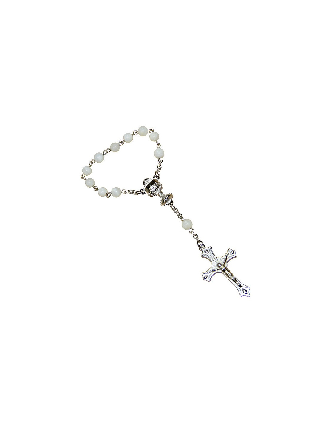 Rosario decenario con cuentas de nácar, cadena y medallas plateadas. El colgante en forma de cruz de Cristo tiene formas hermosas y elegantes. La medalla central es un cáliz eucarístico y está finamente elaborada. El nácar natural es blanco con reflejos crema, símbolo de pureza. Es un regalo perfecto para comunión o bautizo. Dimensiones de la cruz: 23 x 3 x 35 mm