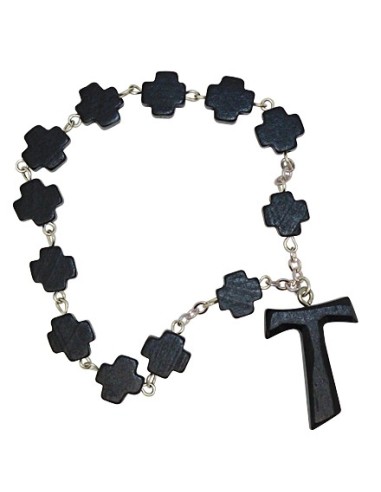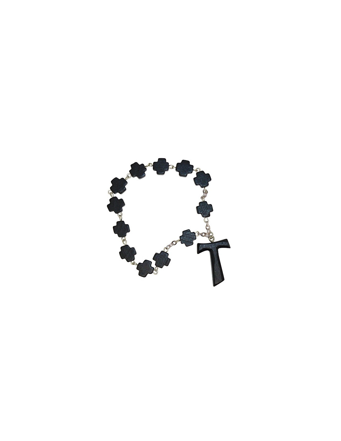 Este decenario de madera negra está compuesto por 10 cuentas en forma de cruz, montadas en una cadena metálica plateada. Termina con una cruz TAU, símbolo fuerte del franciscanismo. Discreto y compacto, cabe en el bolsillo y es perfecto para la oración o como recuerdo espiritual.
