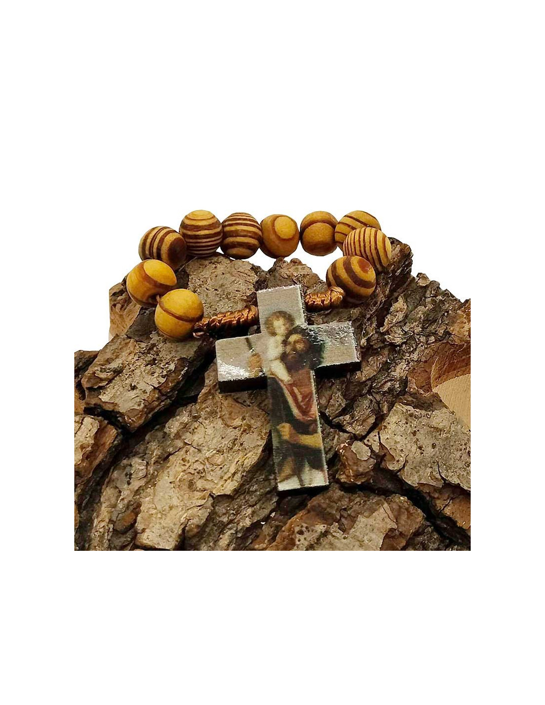 Rosario de madera de olivo. La cruz de Cristo está realizada en madera de color marrón con la figura de Jesús pintada en oro y el retrato de San Cristóbal en el reverso. Este billete tiene un tamaño de bolsillo pequeño, práctico para llevarlo a cualquier parte.