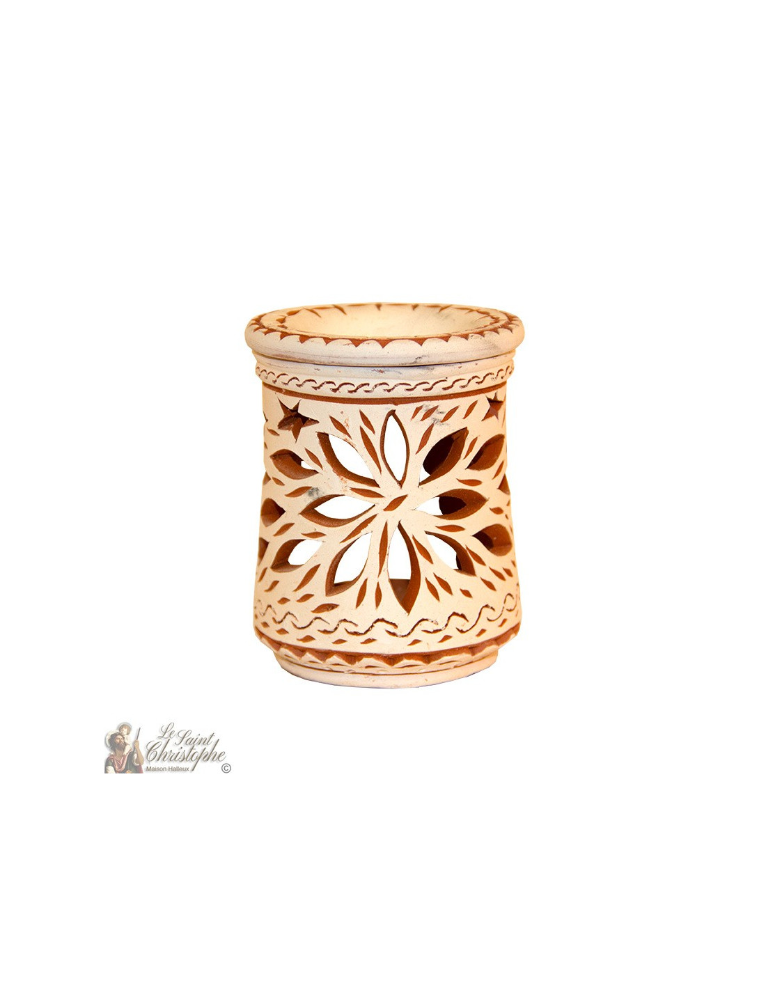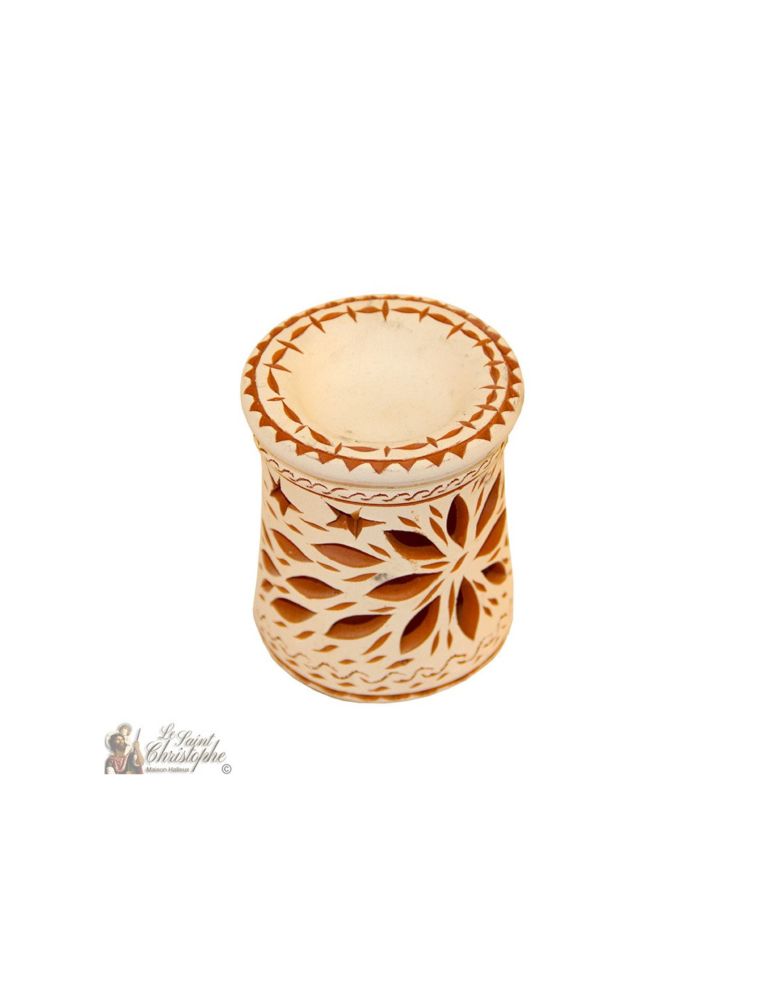 Este quemador de terracota fue hecho a mano por un artesano. Delicada escultura, también se utiliza como portavelas para una suave atmósfera tamizada colocando una pequeña vela en la parte posterior del objeto.