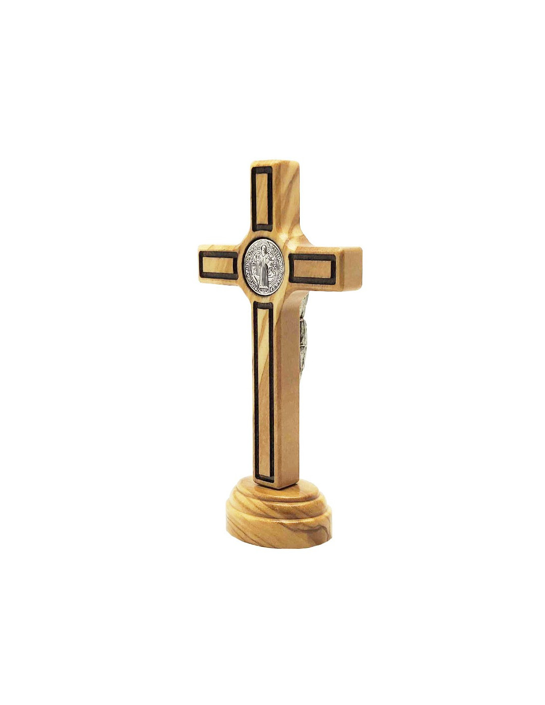Esta cruz de San Benito de madera de olivo es una magnífica pieza espiritual, sobria y a la vez llena de fuerza. Montada sobre una base, destaca por la cálida belleza de su madera de olivo natural, realzada por la presencia de Cristo y la medalla de San Benito, ambos elaborados en un hermoso metal plateado. La medalla de San Benito, colocada en el centro de la cruz, es un poderoso símbolo de protección contra el mal y las pruebas. Se le atribuye protección espiritual contra las influencias negativas y las fuerzas del mal. Las inscripciones en latín que lleva invocan la bendición divina y la protección contra el mal en todas sus formas. La madera de olivo siempre ha sido símbolo de paz, perseverancia y fidelidad. Utilizada para objetos sagrados, conecta la oración diaria con profundas raíces bíblicas, evocando en particular los lugares sagrados de Jerusalén y la fuerza espiritual que ofrece la naturaleza.