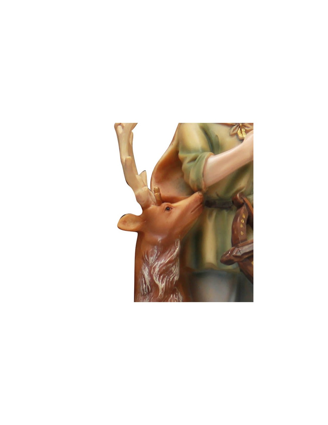 Hecha y pintada a mano: cada tono ha sido elegido cuidadosamente para resaltar al santo y a su ciervo con la cruz — símbolo de conversión y protección.