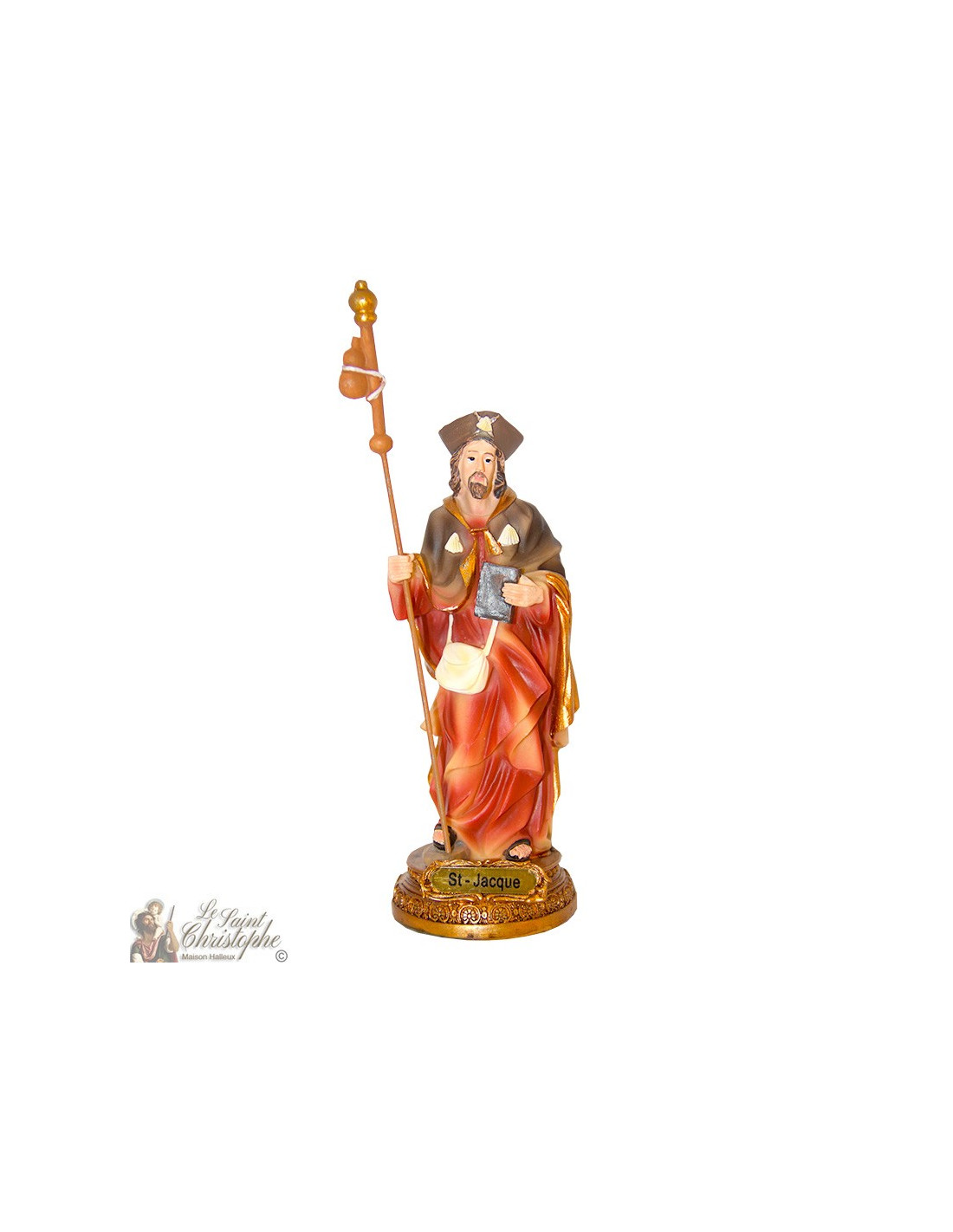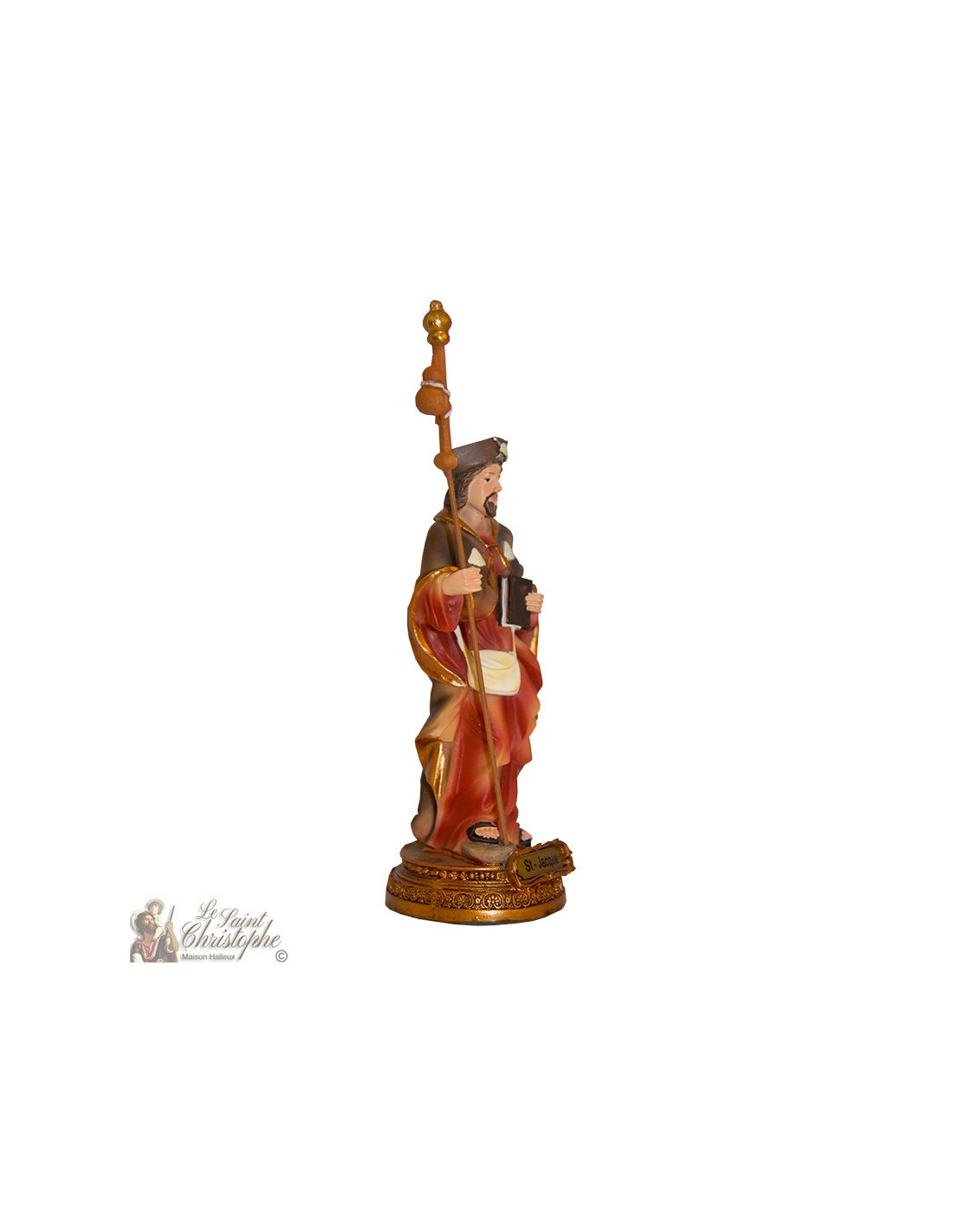 Estatua de resina, pintada y hecha a mano, con la efigie de Santiago de Compostela, representada con su bolsa, su Biblia, su bastón y la concha de su sombrero, el símbolo emblemático del santo.