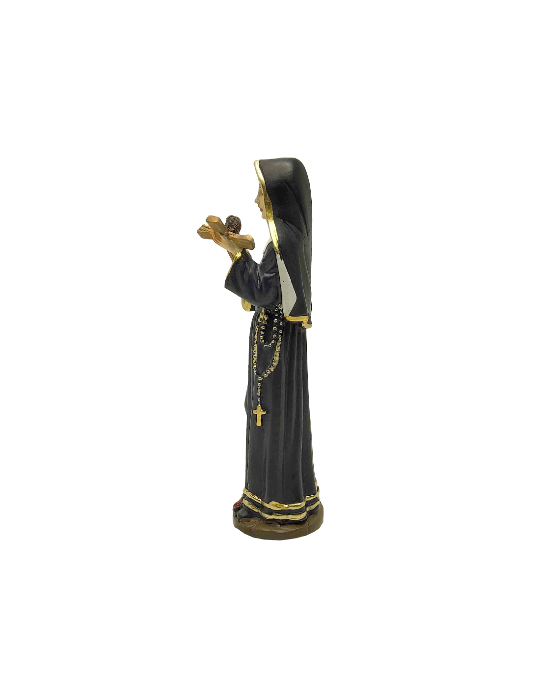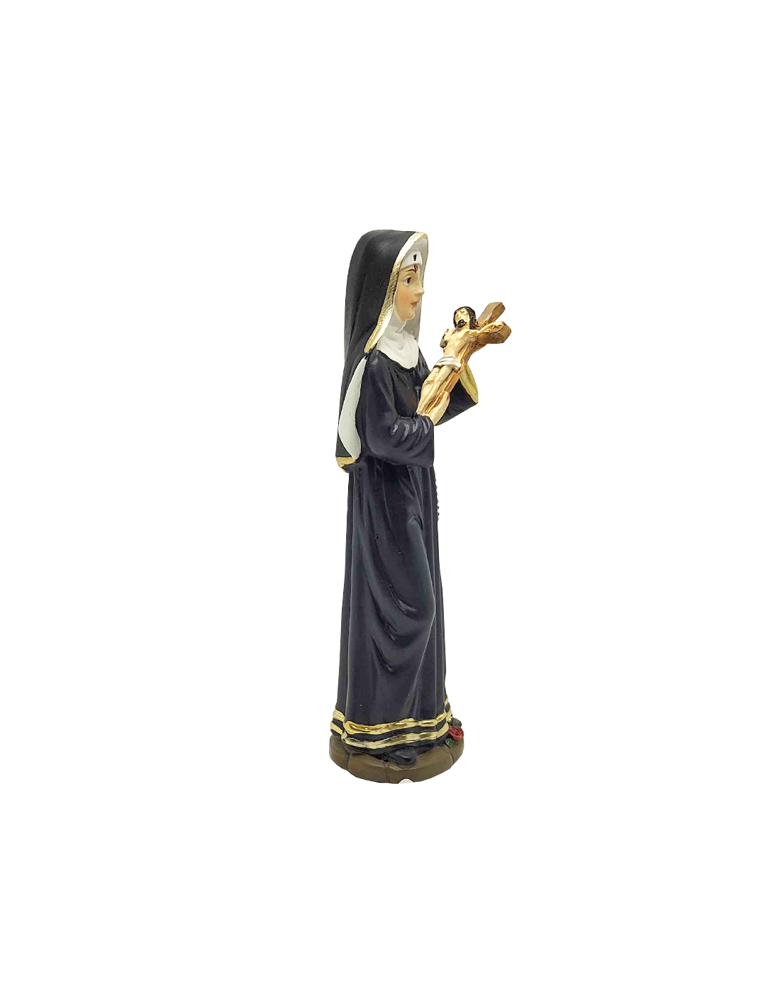 Esta elegante estatua de Santa Rita, patrona de las causas desesperadas y las situaciones difíciles, está realizada completamente a mano con especial cuidado en cada detalle.