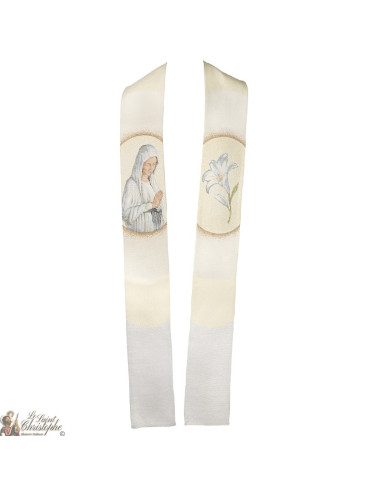 Esta estola sacerdotal está tejida con la imagen de la Virgen de los Pobres de Banneux, Notre-Dame, y una flor de lis. El fondo beige cremoso es de una delicada gradación. El tejido es un auténtico tapiz bordado con un acabado admirable, inspirado en los tapices de Brujas.