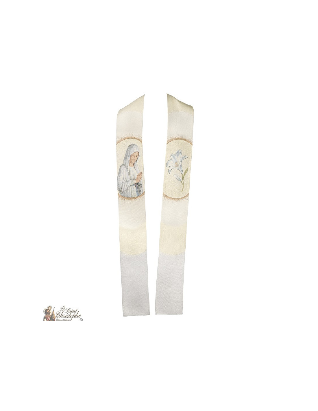 Estola sacerdotal bordada con la Vierge des Pauvres de Banneux Notre-Dame en el lado derecho y una flor de lis en el izquierdo. El bordado sigue el estilo de los tapices de Brujas.