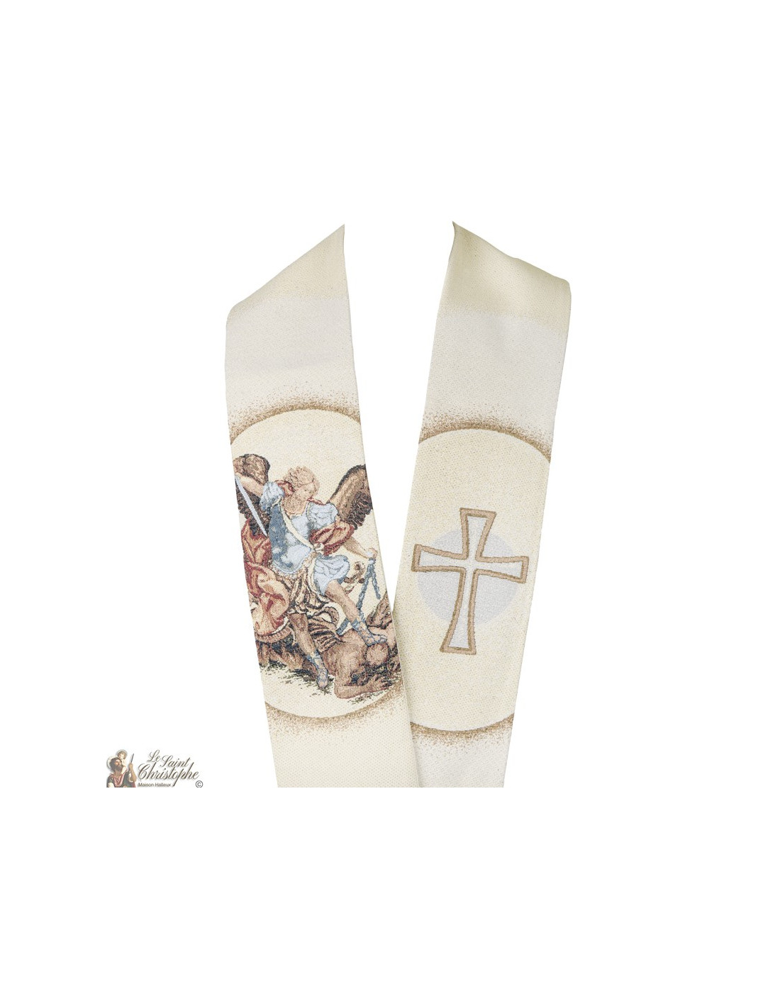Esta estola sacerdotal está tejida con la imagen del arcángel San Miguel y una cruz de flores. El fondo beige cremoso es una delicada gradación. El tejido es un auténtico bordado de tapicería con un acabado admirable, inspirado en los tapices de Brujas.