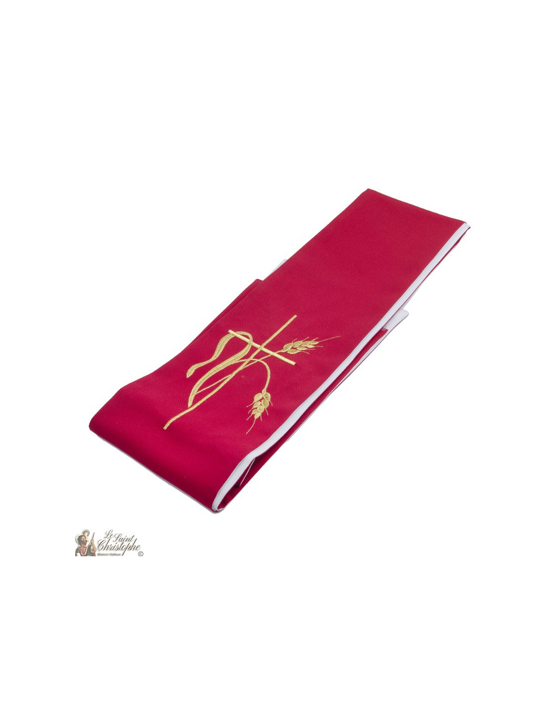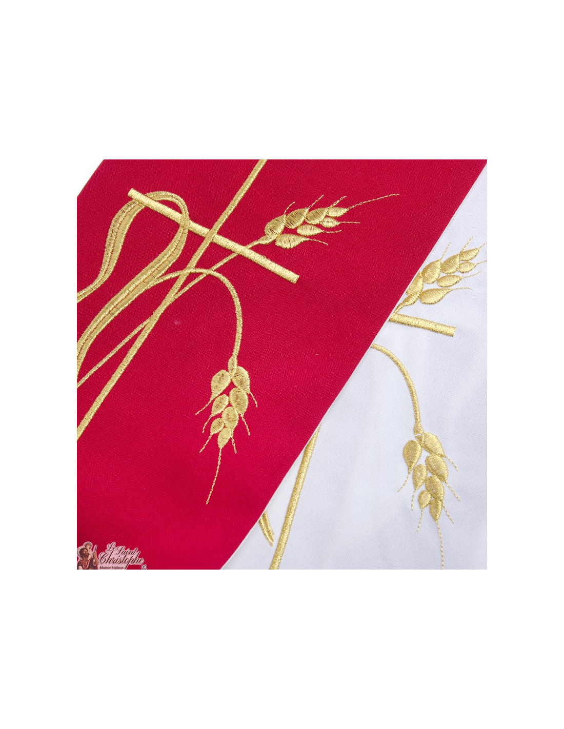 Esta estola sacerdotal bicolor es de doble cara o reversible. Un lado es rojo, el otro blanco. Ambas caras están bordadas con hilo de oro, cuatro bordados idénticos. El diseño representa una cruz con dos espigas de trigo.