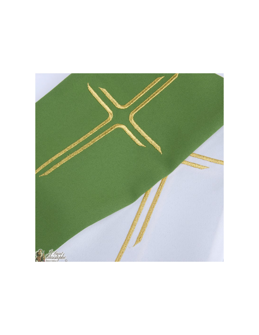 Esta estola sacerdotal bicolor es de doble cara o reversible. Un lado es blanco, el otro verde. Ambas caras están bordadas con hilo de oro, cuatro bordados idénticos. El diseño representa una cruz en un estilo moderno y sencillo.